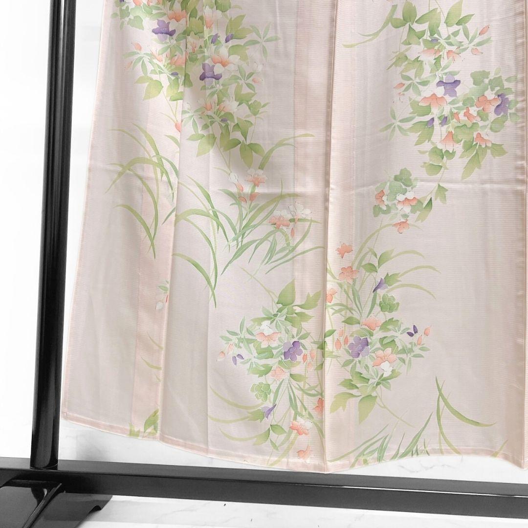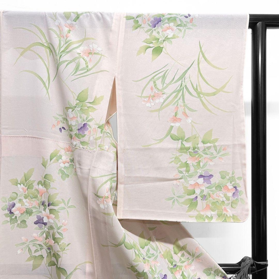 淡く柔らかな桜色のお色味に若葉のリーフや可憐な花模様が繊細に描かれた一着です。
