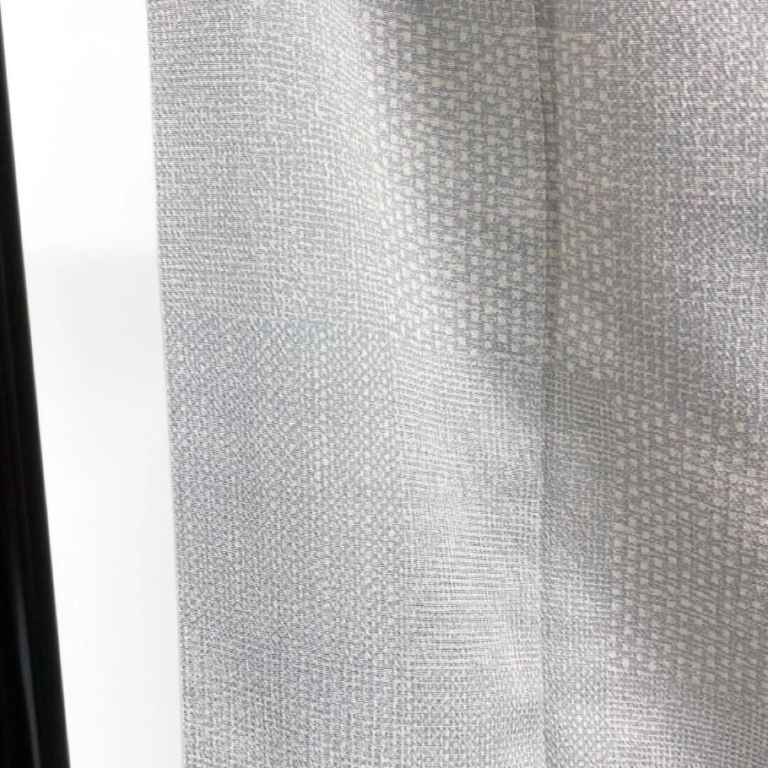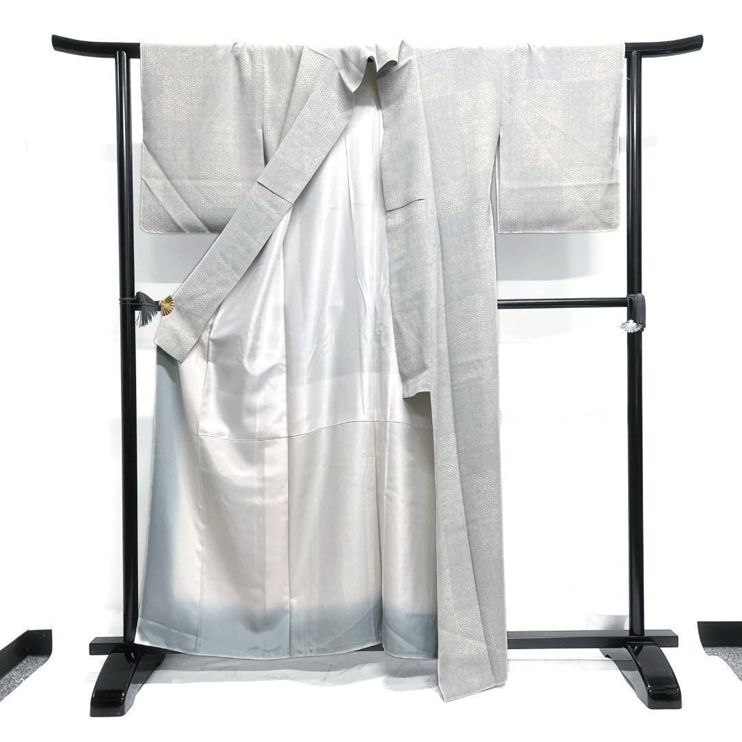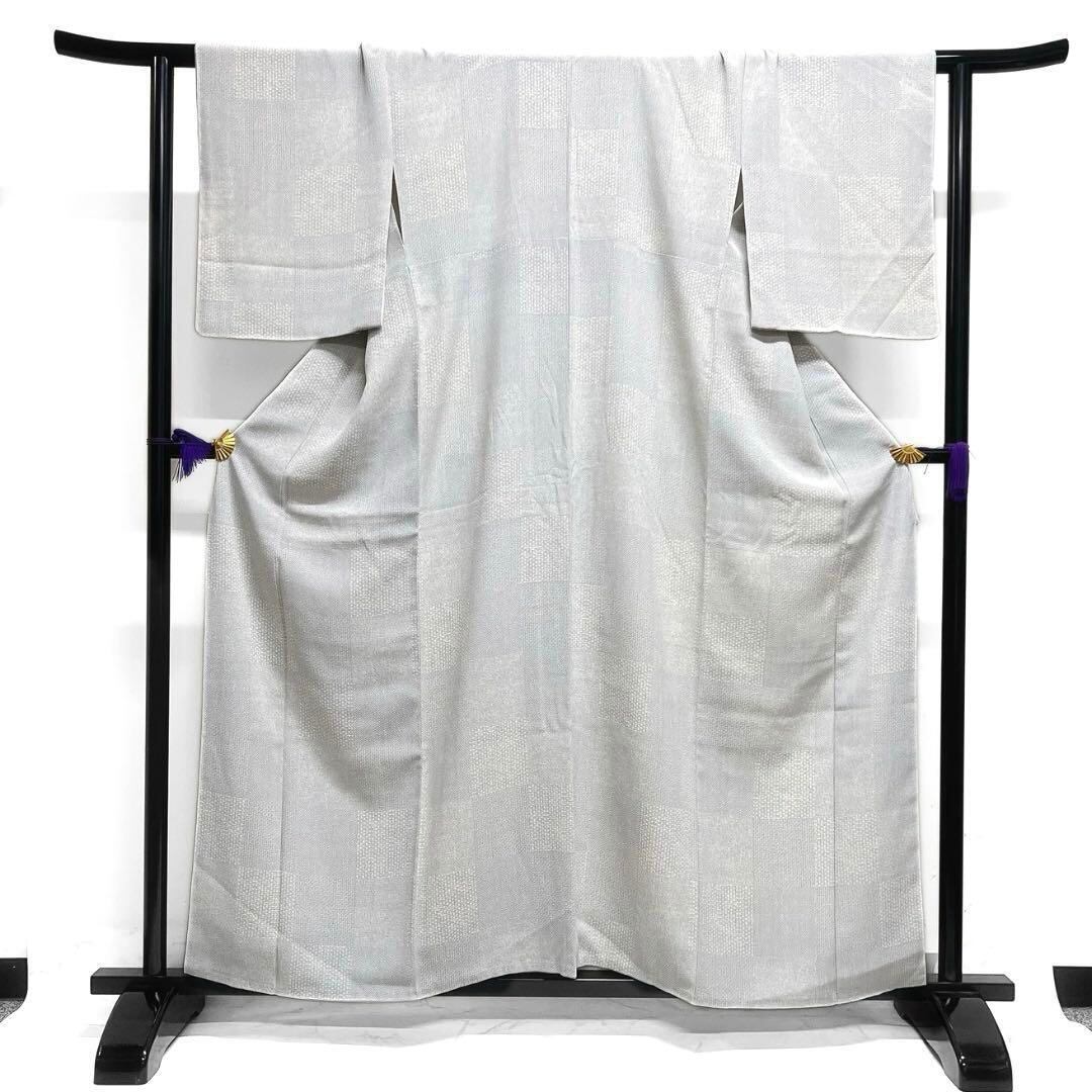 ちりめんの地に薄いグレーとホワイトで描かれた幾何学文様の変わり市松文様がお洒落なデザインの一着です。
