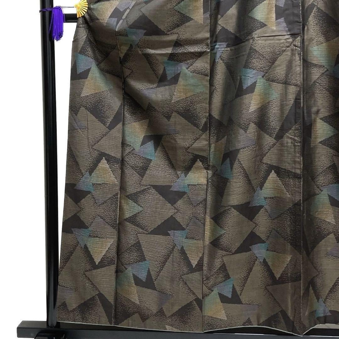 大島紬の泥染の地に三角の鱗文様が織られたお洒落なデザインの一着です。