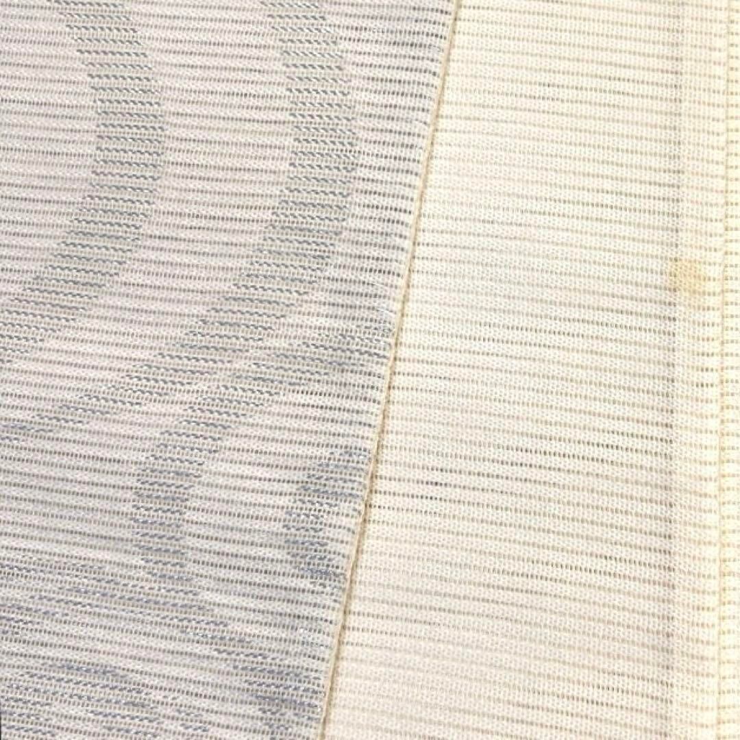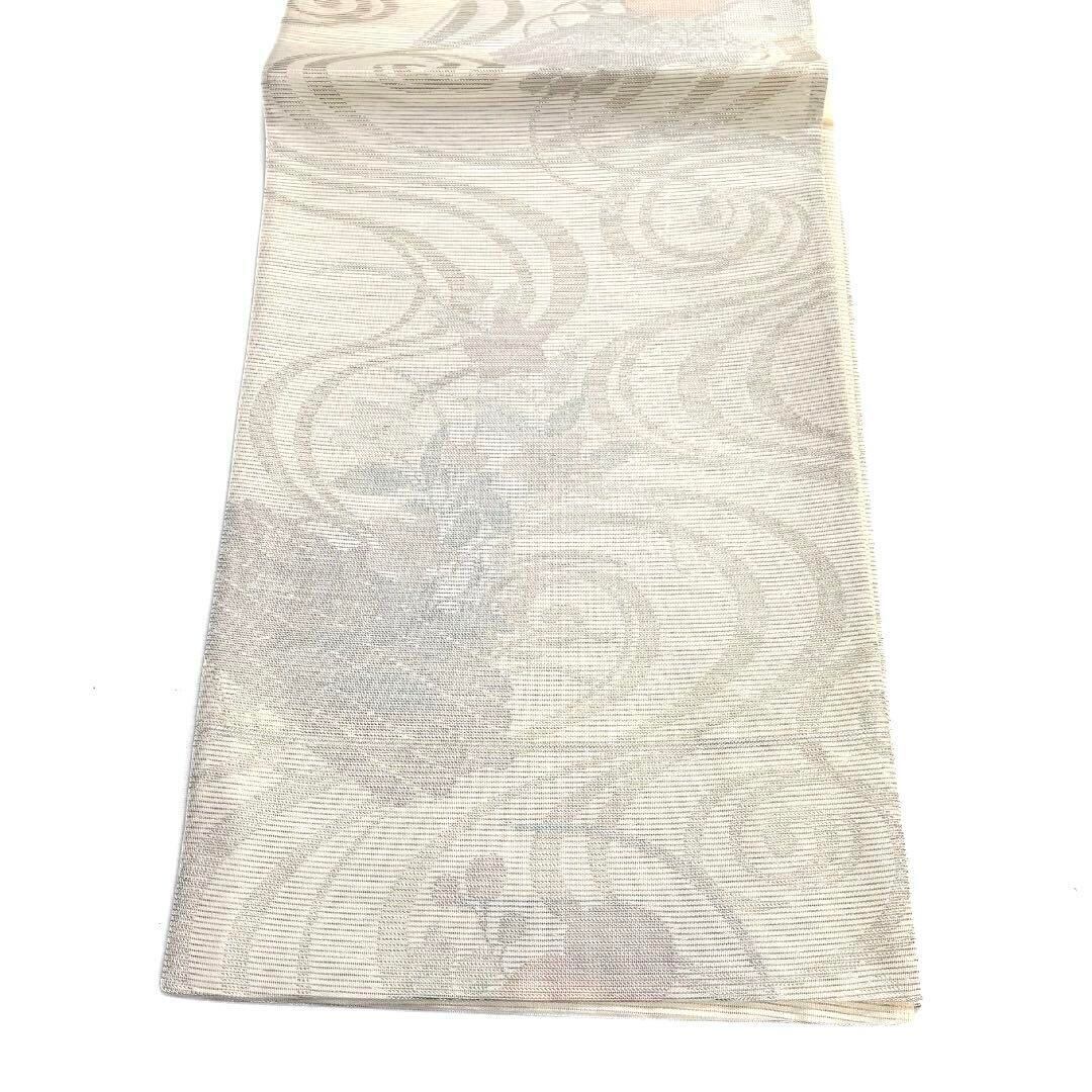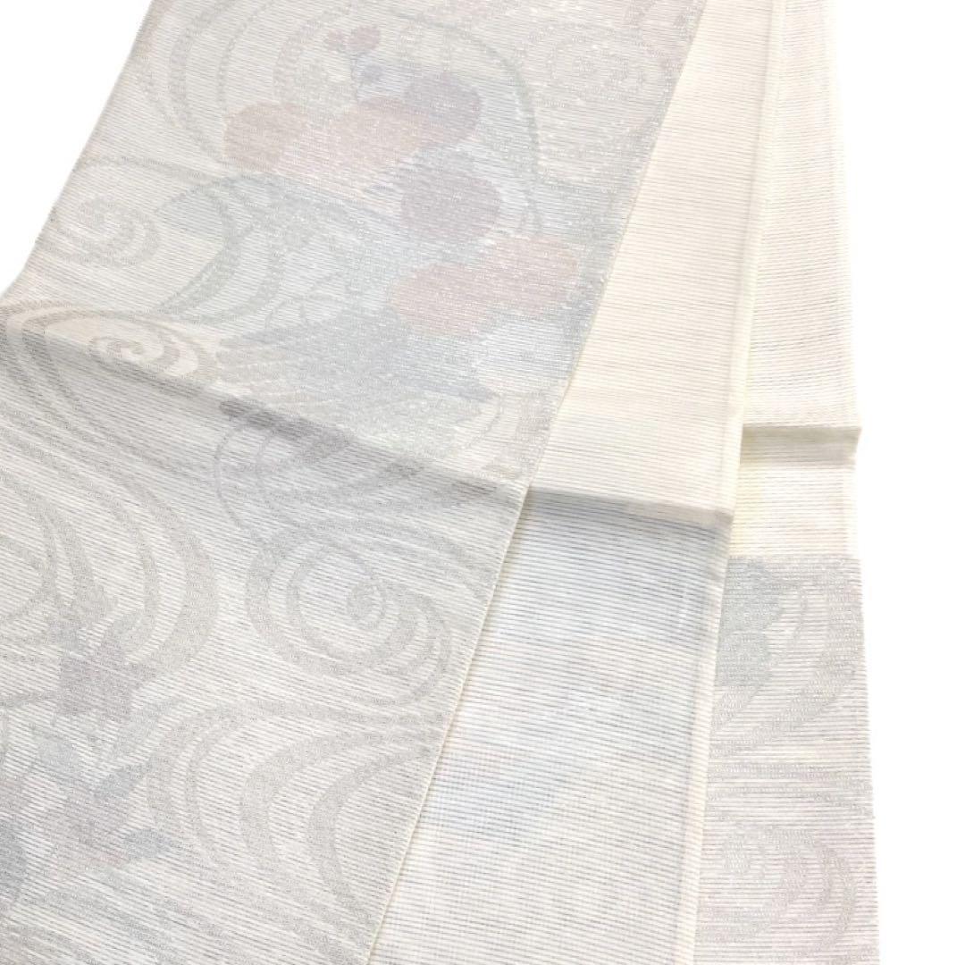白の絽の地に銀の流水に淡い色味の花模様が織られたお洒落なデザインの一着です。