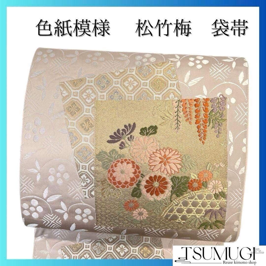 色紙模様に松竹梅や菊花、藤の花が織り出された袋帯です。