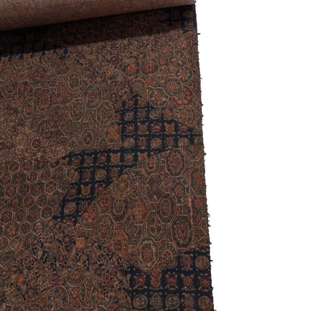 結城紬の地にくすみカラーで描かれた扇に華紋や亀甲の文様がお洒落なデザインの一着です。