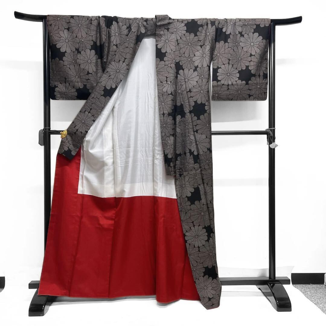 泥染の大島紬の黒地に菊花の文様が織られたお洒落なデザインの一着です。