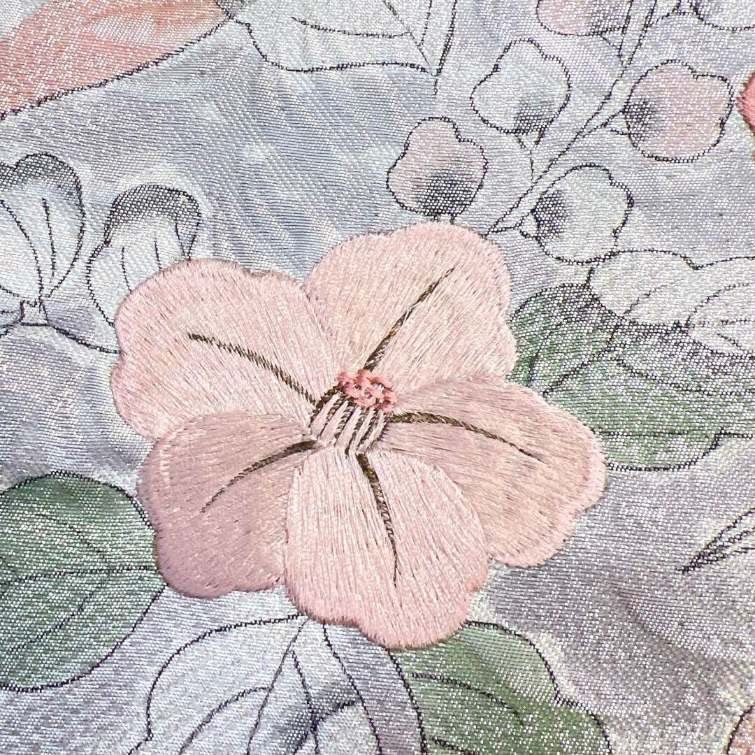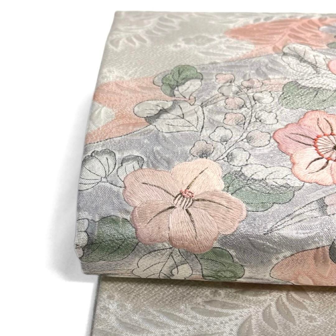 シルバーの膨れ織りの地に流水に刺繍の辻ヶ花や椿の文様が織られた華やかなデザインの一着です。