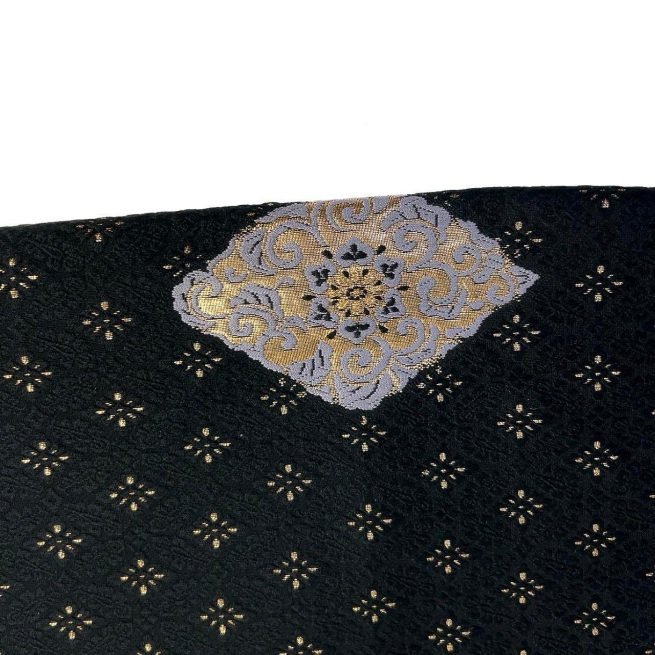 黒地に映えるゴールドとくすみカラーで織られた花菱の文様がお洒落な雰囲気の一着です。