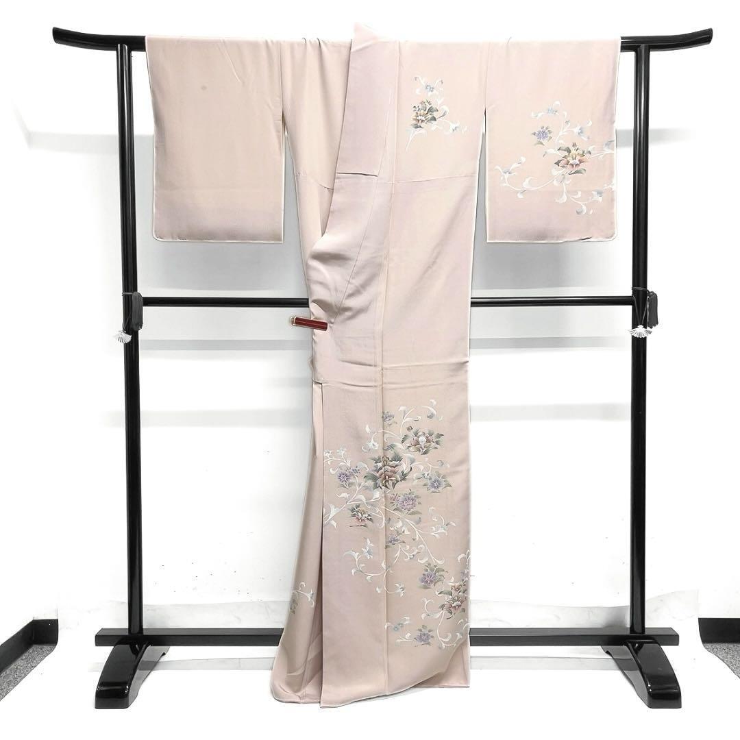 くすみのピンクの縮緬の地に唐花模様と唐草の文様が描かれた華やかなデザインの一着です。