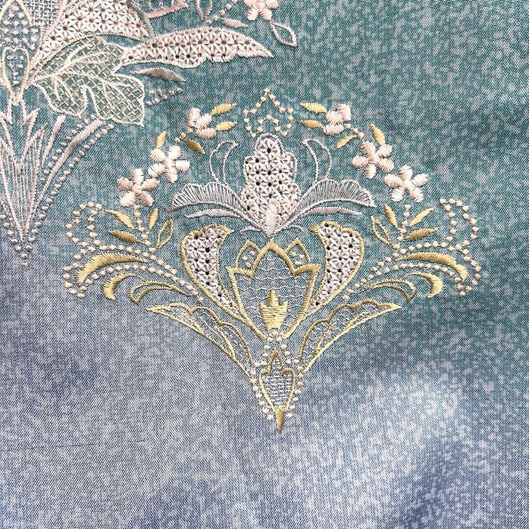染大島紬のくすんだピーコックグリーンのたたき染地にスワトウ刺繍と刺繍で織られたティアラのような唐花文様が華やかなデザインの一着です。