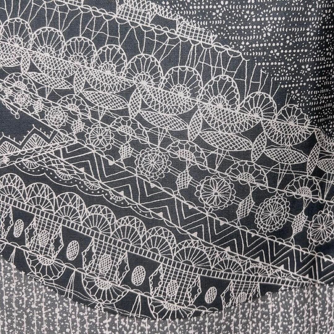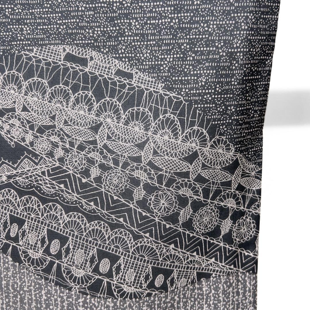 染大島紬のグレーの地に白のモノトーンで描かれたよろけ横縞に流線や幾何学模様、江戸小紋風や花模様が描かれたお洒落な雰囲気の一着です。