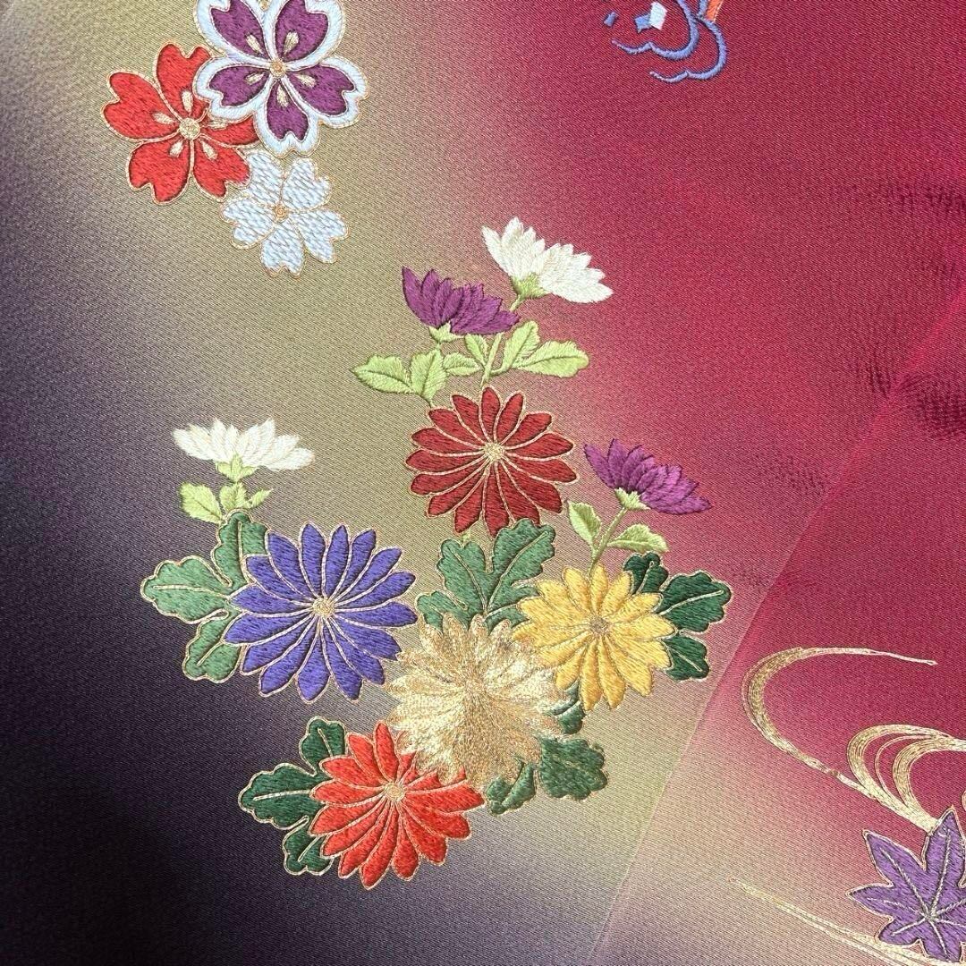牡丹や桜花、藤などの吉兆の印とされる花模様が繊細な美しい刺繍でデザインされた1着です。