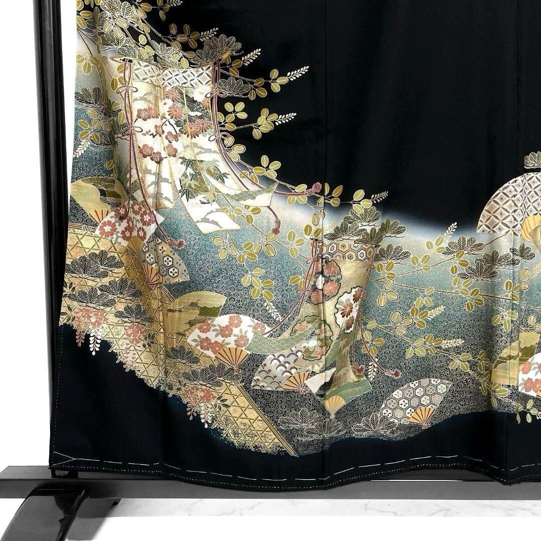几帳や扇、籠目を松竹梅などの花模様が金駒刺繍や刺繍、金彩を交えて描かれた豪華で華やかな一着です。