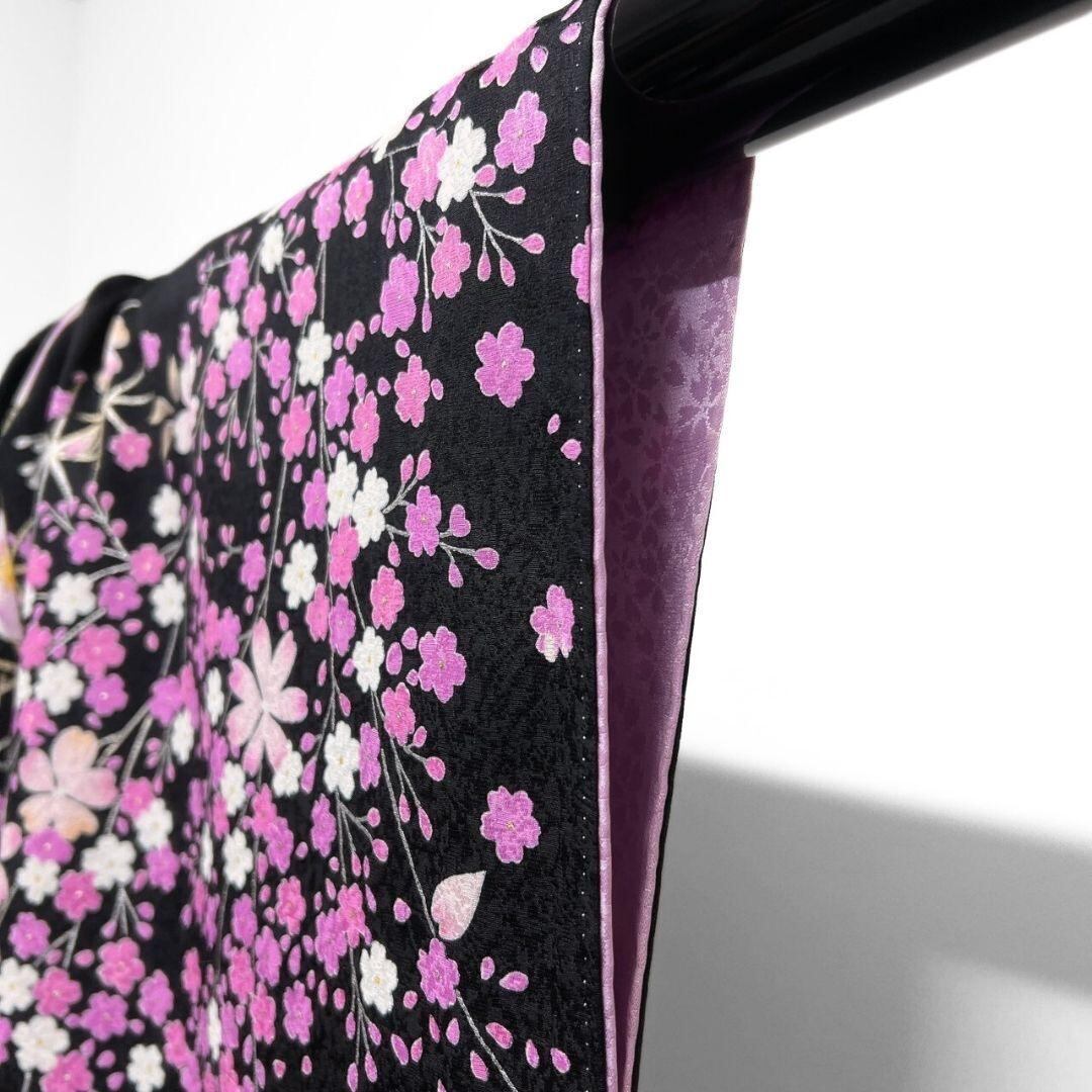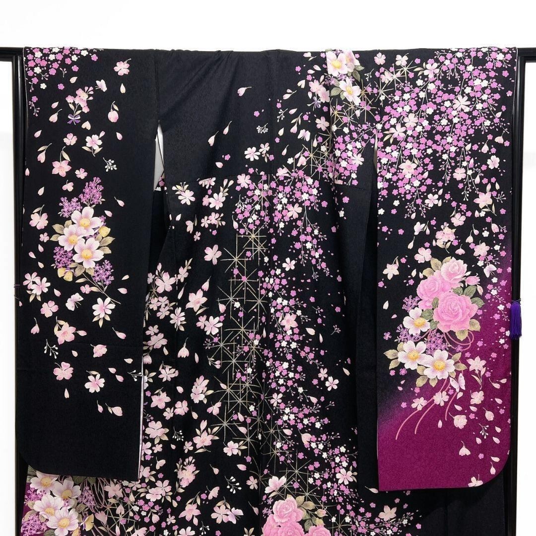 薔薇や枝垂れ桜、麻の葉が繊細なタッチと美しいグラデーションでデザインされた1着です。
