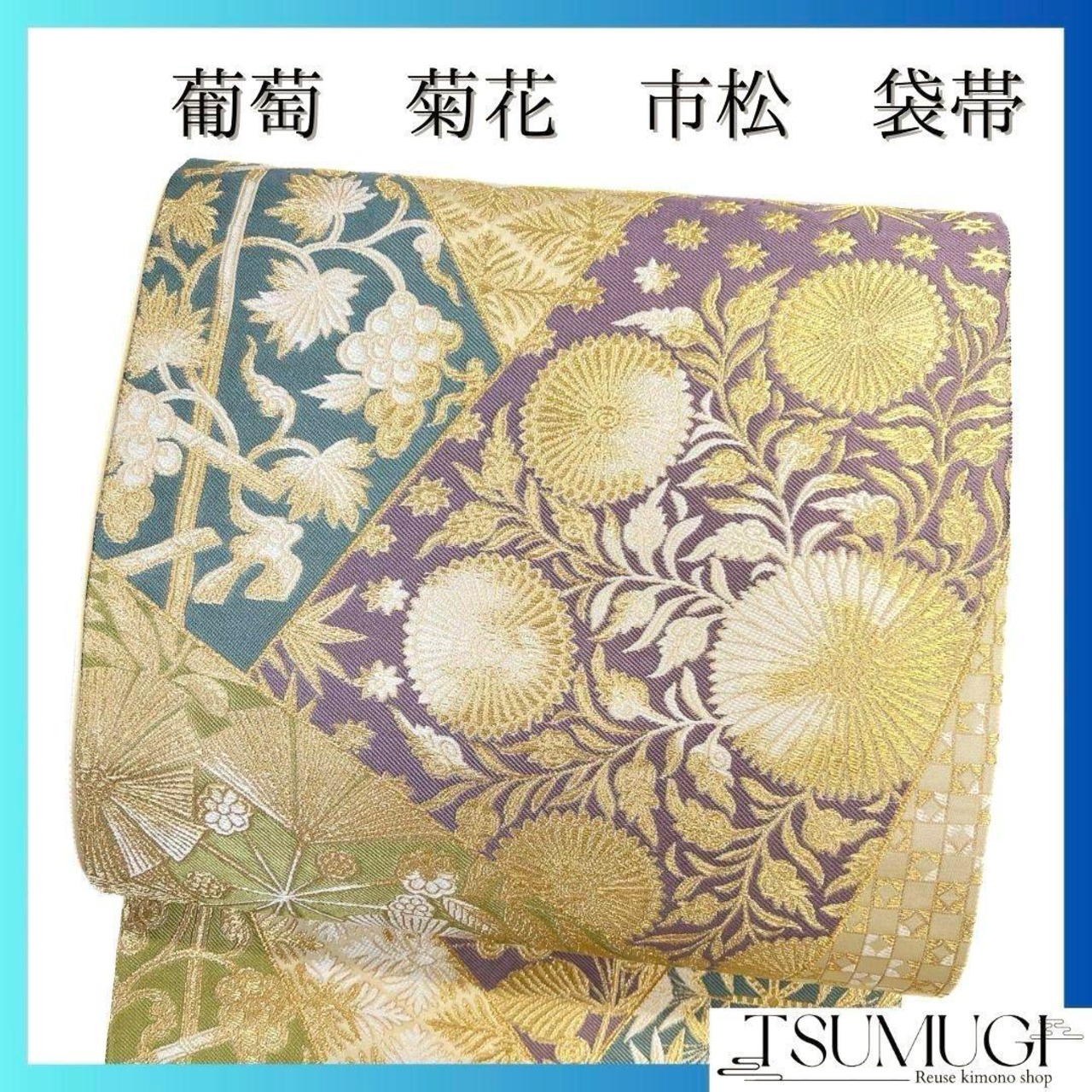 裂取に葡萄や菊花、松菱、市松模様が織り出された袋帯です。