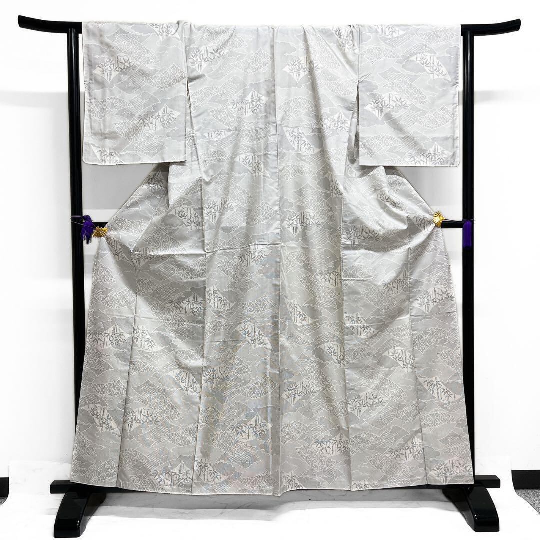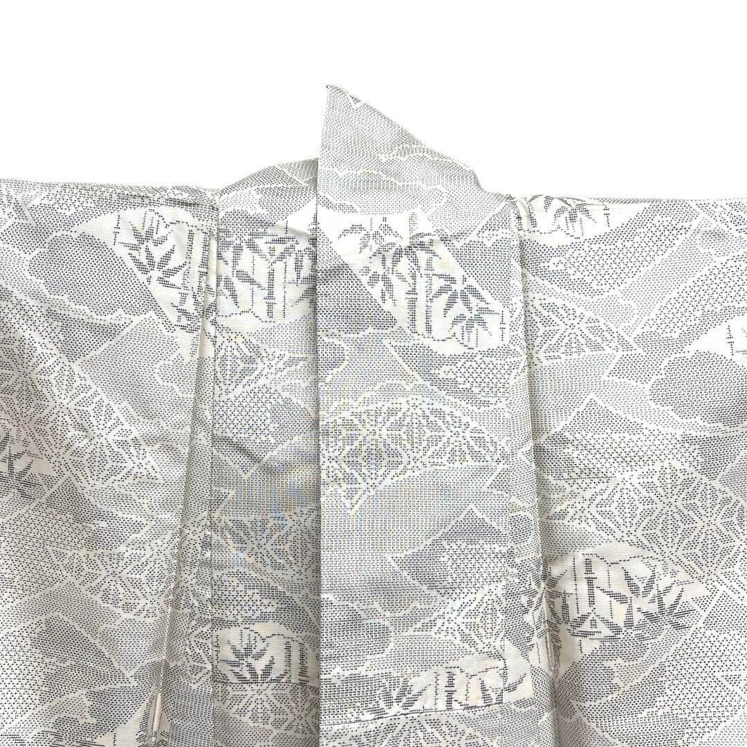 上品な白大島紬の地に雲と短冊に竹と麻の葉の文様が織られたお洒落なデザインの一着です。