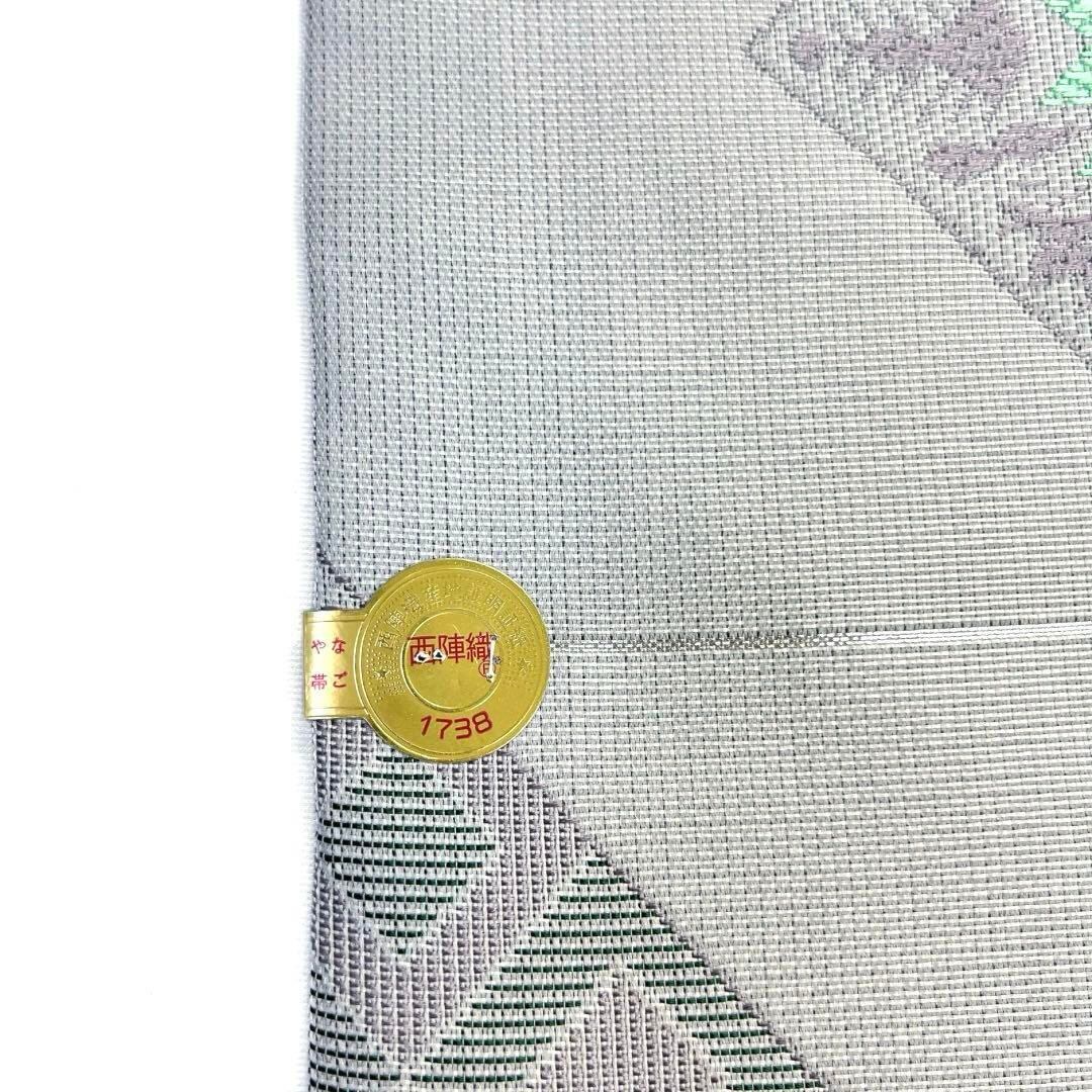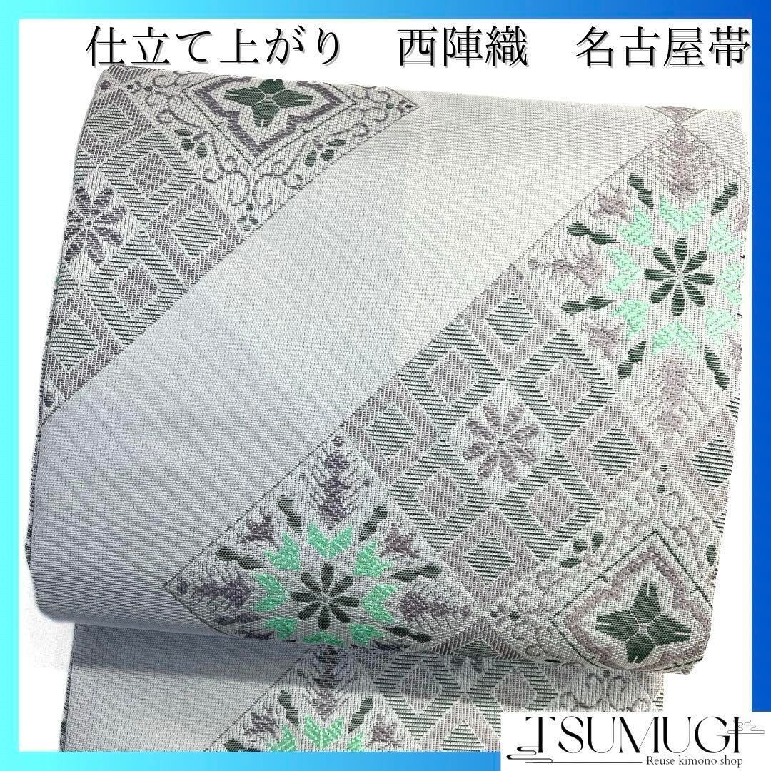 薄いグレーの地に菱の文様にライトグリーンの織りが目を惹く華紋の文様がお洒落なデザインの一着です。