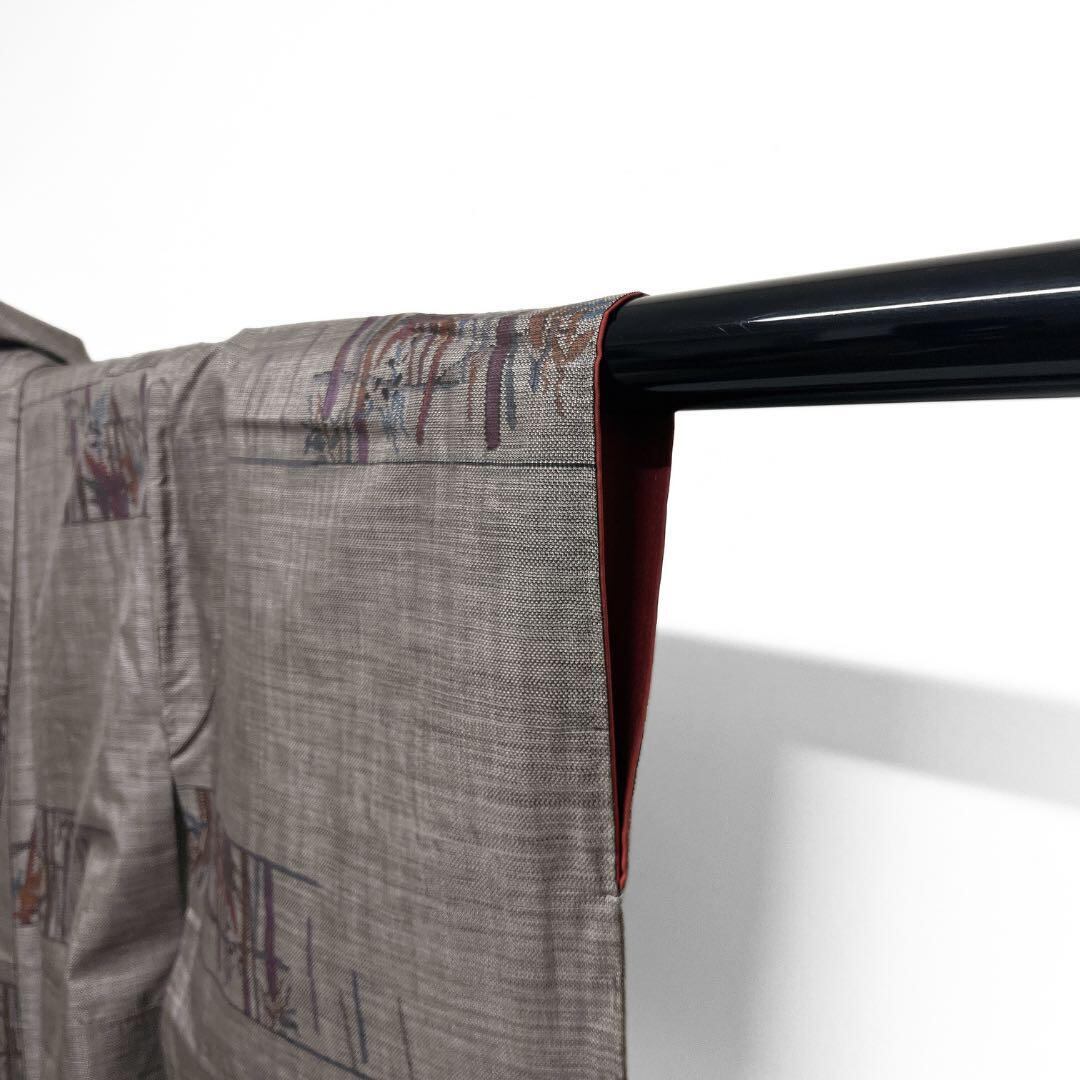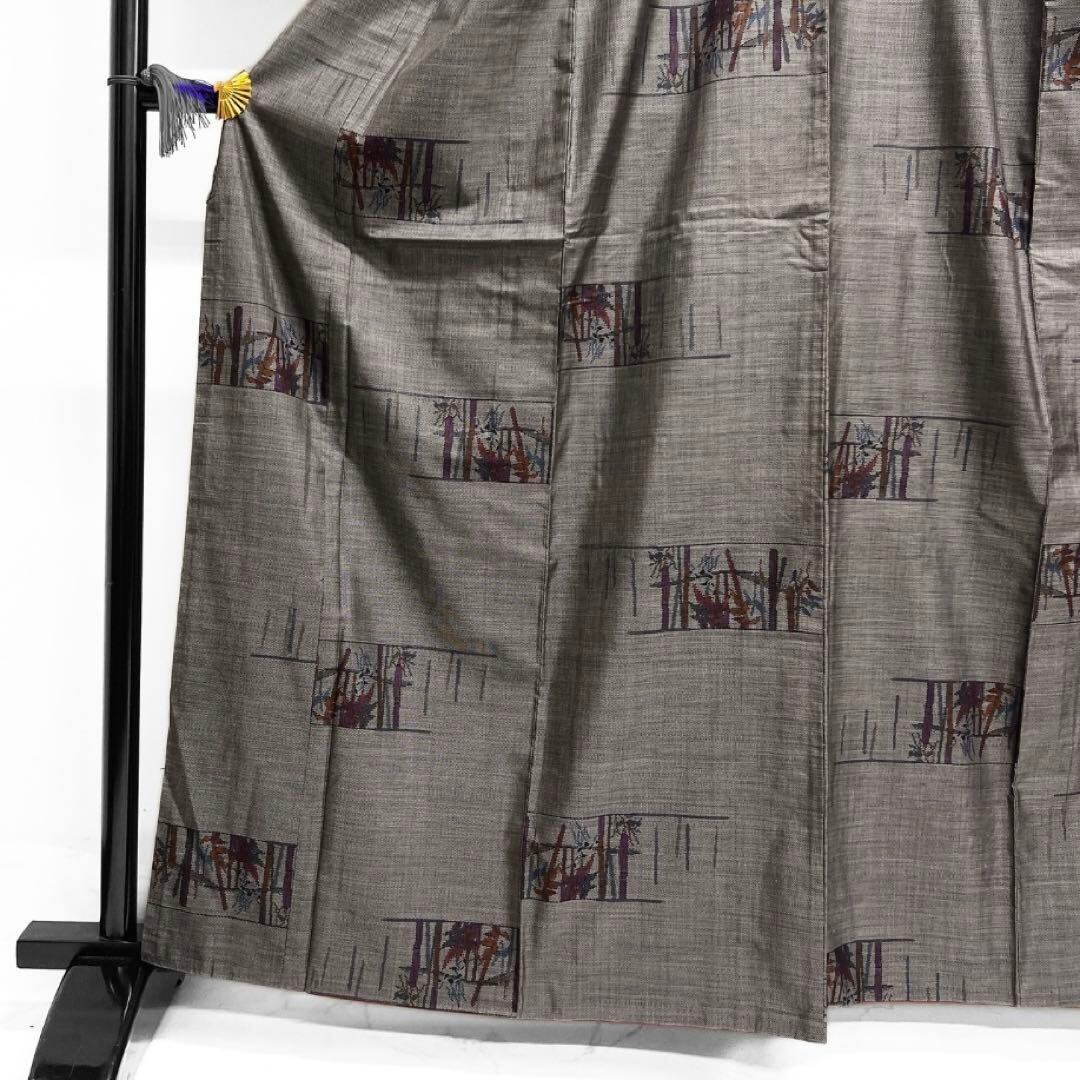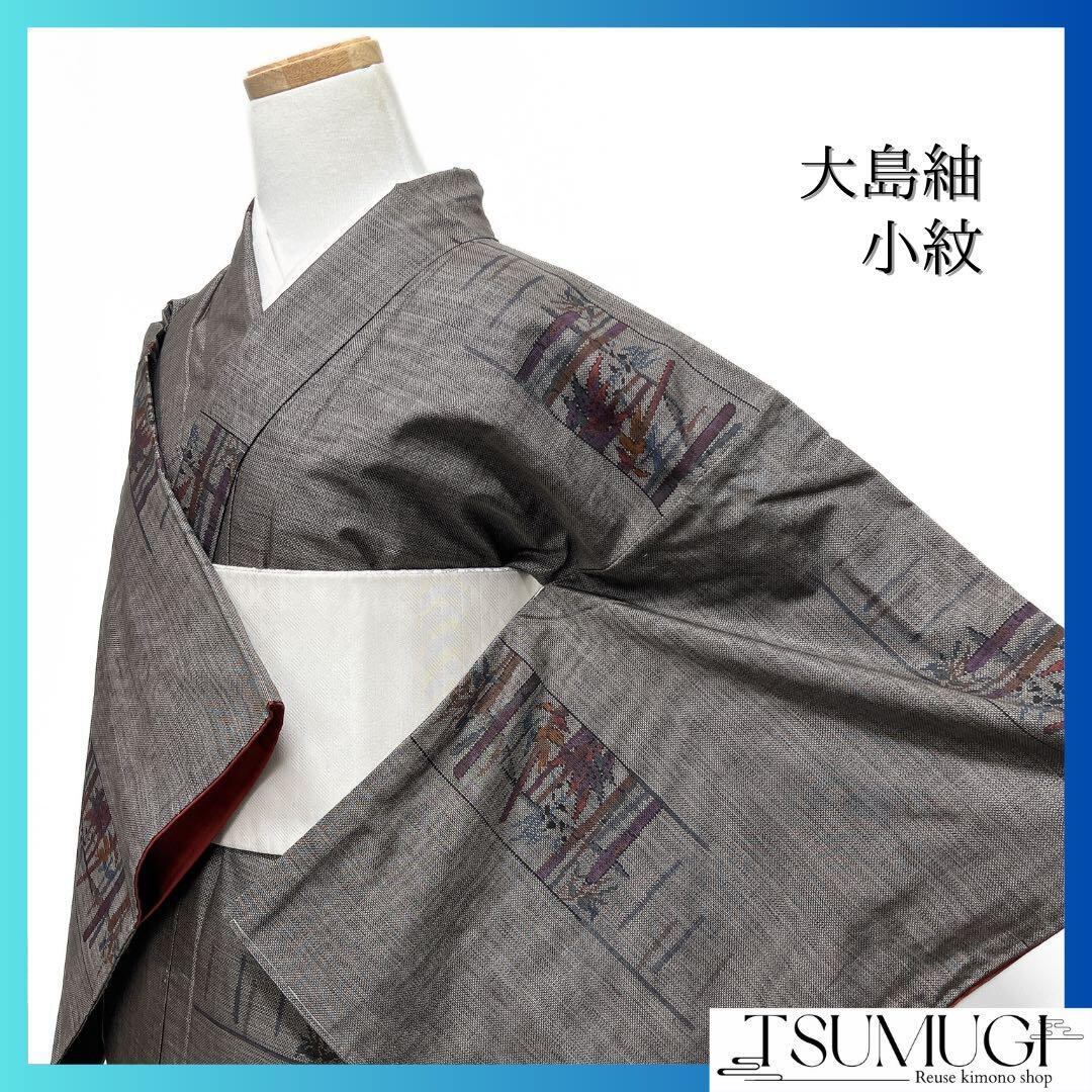 泥染の大島紬の地に細やかに織られた破れ横縞に竹の文様がお洒落なデザインの一着です。
