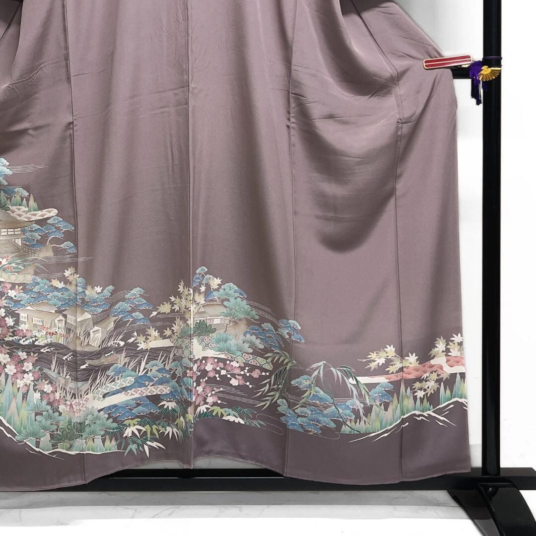 薄いくすみのパープルの地に描かれた松竹梅に菊花や桜、ヱ霞に伝統和模様と茶屋辻の風景文様が描かれた華やかなデザインの一着です。