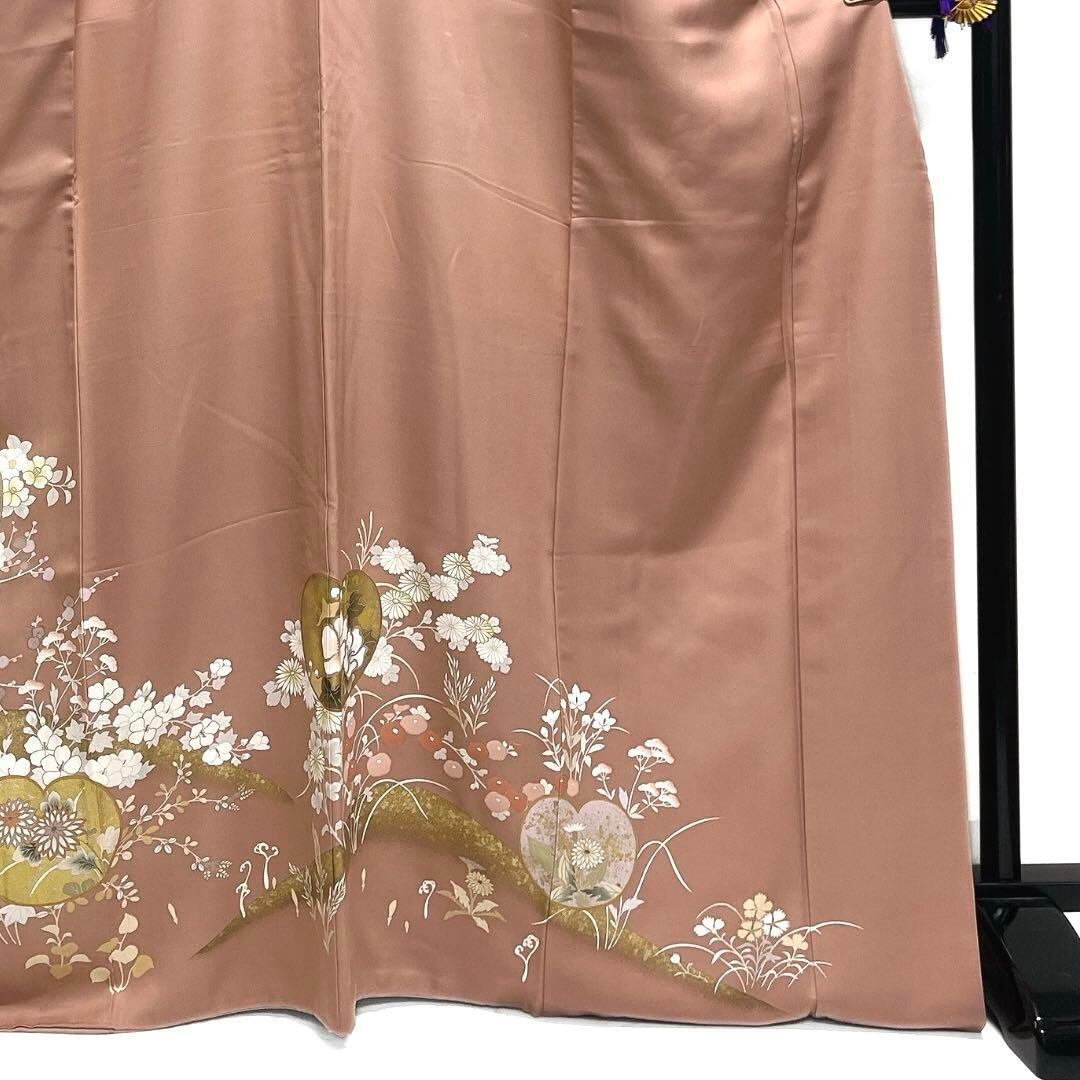 くすんだサーモンピンクの地に金駒刺繍の牡丹に椿や菊花、芙蓉ら桔梗が描かれた華やかなデザインの一着です。