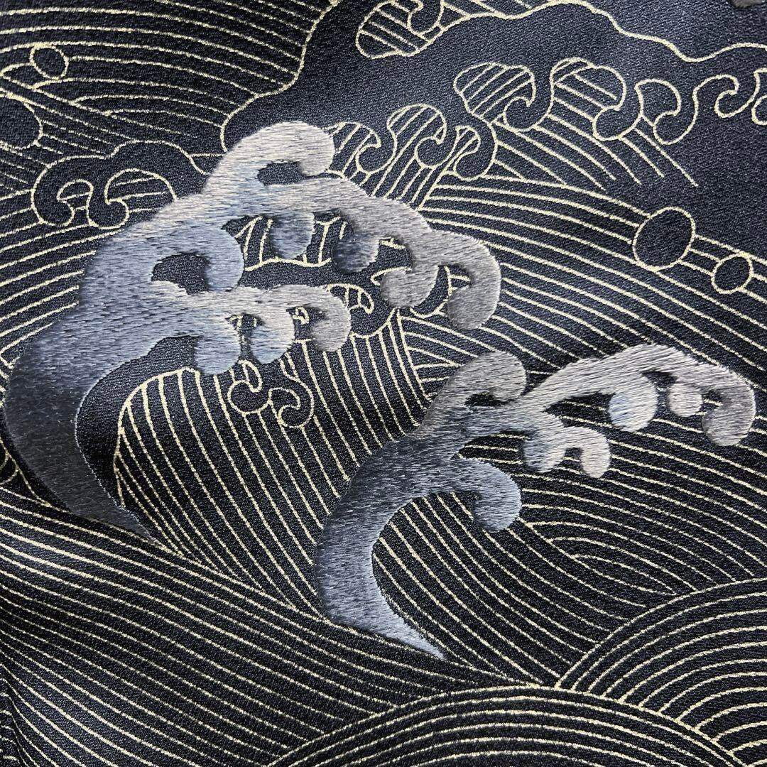 深いネイビーの地に刺繍を交えて描かれた波に流水と水玉の文様がお洒落なデザインの一着です。