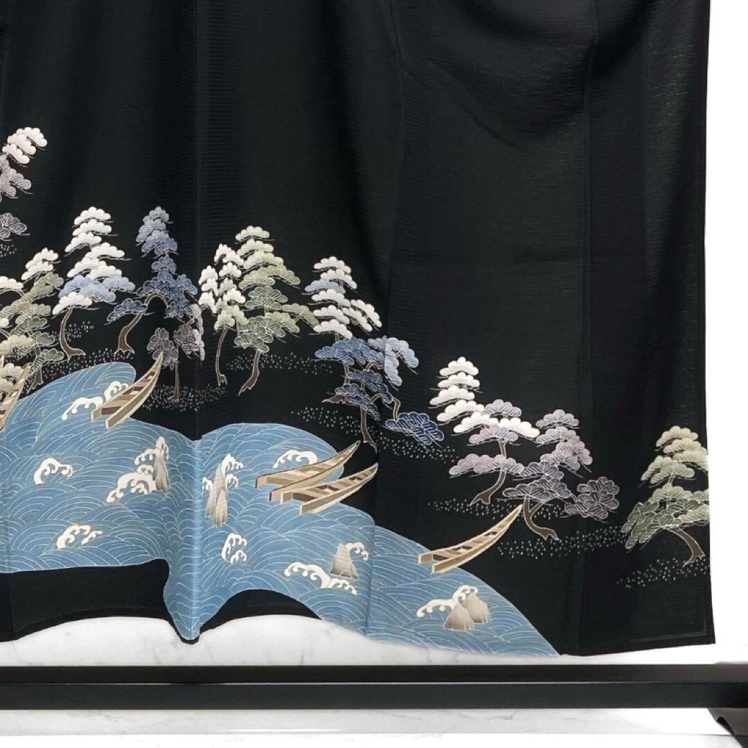 絽の黒地に金彩を交えて描かれた波に舟と松の文様が描かれた華やかなデザインの一着です。
