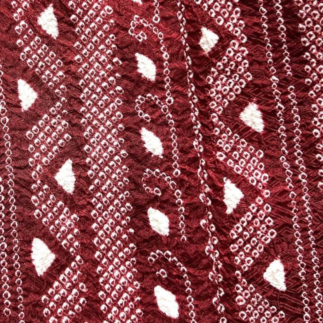 ガーネットカラーの花紗綾形地紋の地に総絞りで描かれた縦縞の文様がお洒落なデザインの一着です。