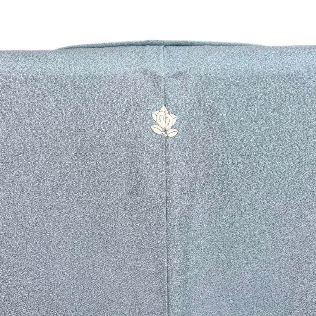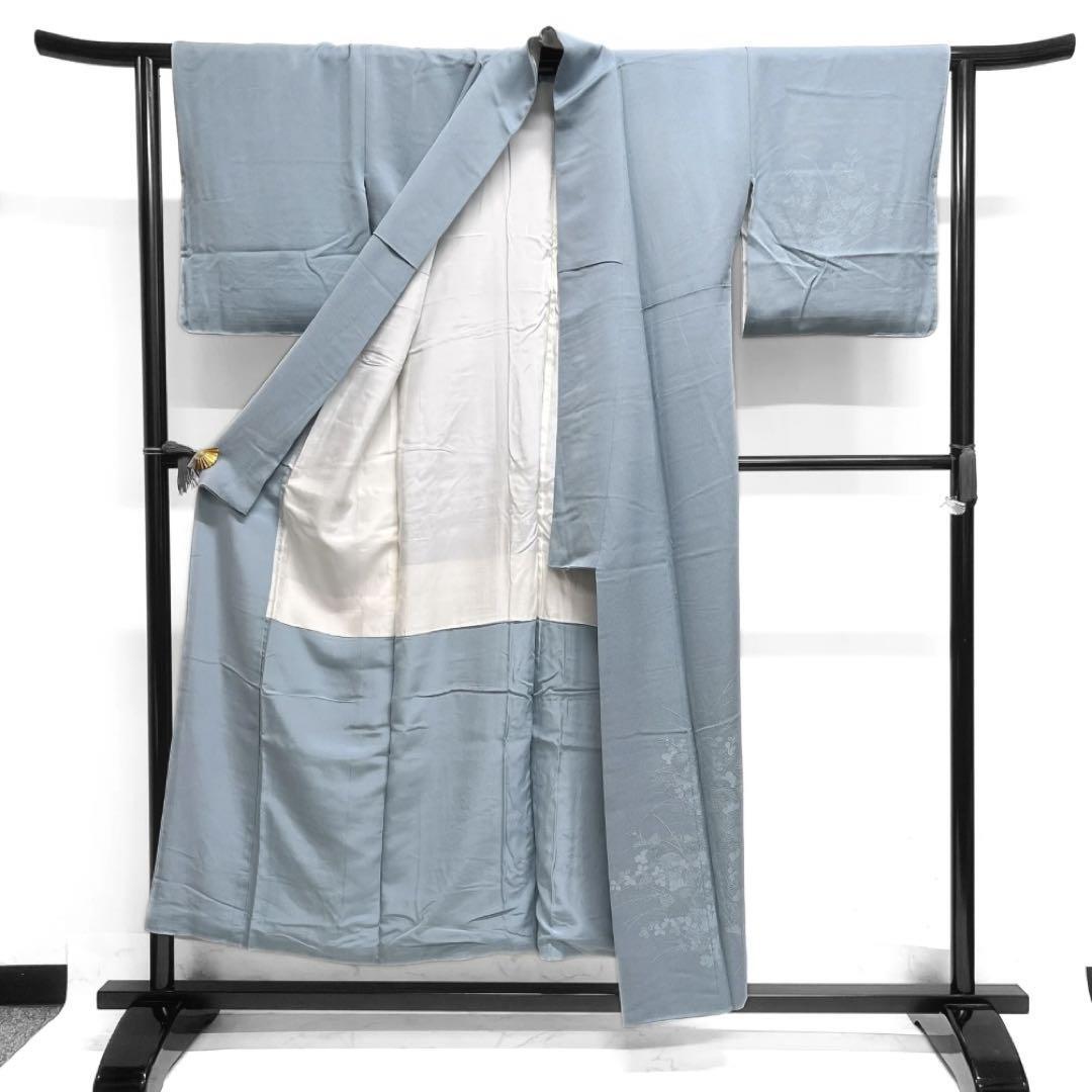 くすみカラーのライトブルーの地に菊花や萩の文様が織られたお洒落なデザインの一着です。