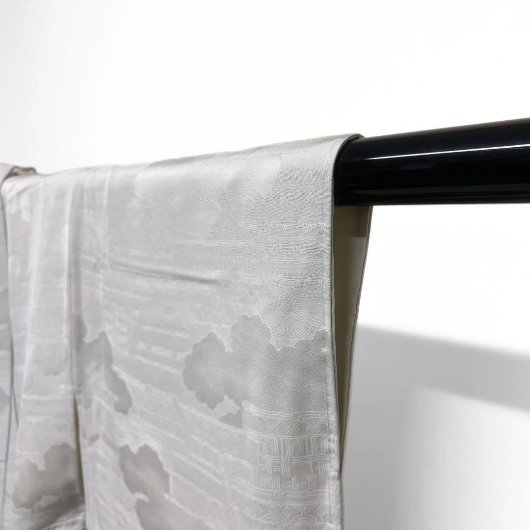上品な白に近い薄いグレーの地に雲と垣根の地紋が織られたお洒落な雰囲気の一着です。