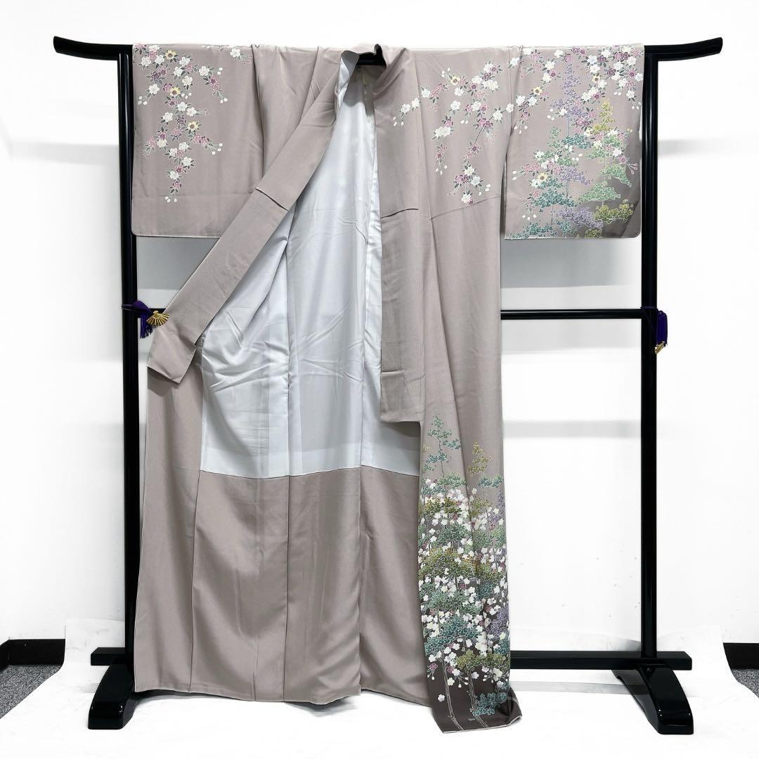 くすみの薄いパープルの地に細やかに描かれた枝垂れ桜に桜花、木々の文様が目を惹く華やかなデザインの一着です。