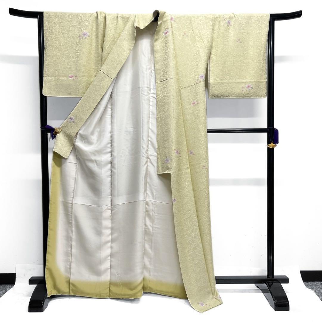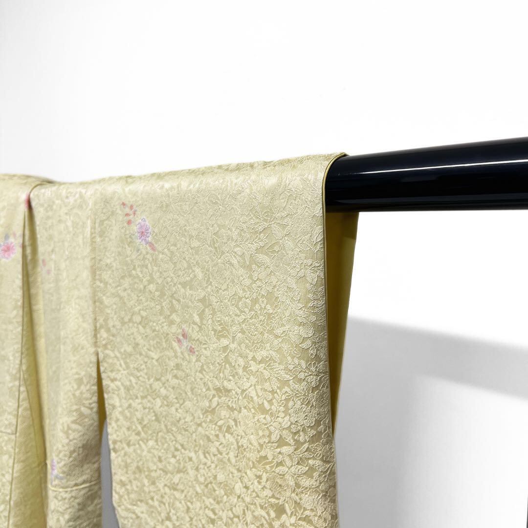 花模様地紋の緑のかかったイエロー地に映えるピンクの辻ヶ花の文様がお洒落なデザインの一着です。