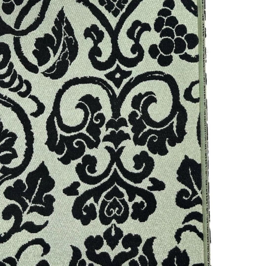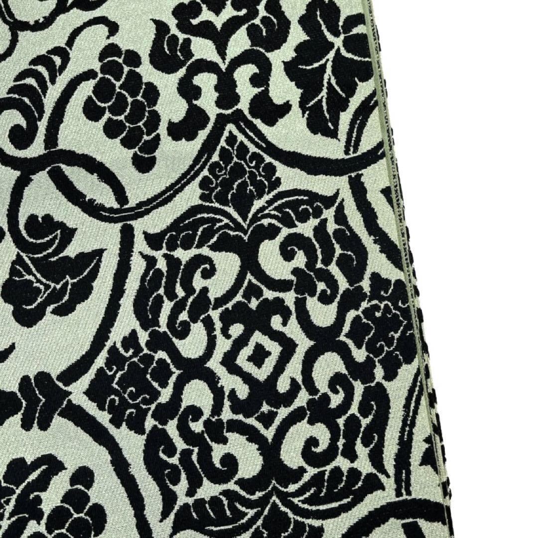 薄いくすみグリーンの金通し地に映える黒の唐草葡萄のと唐花文様が目を惹く華やかなデザインの一着です。