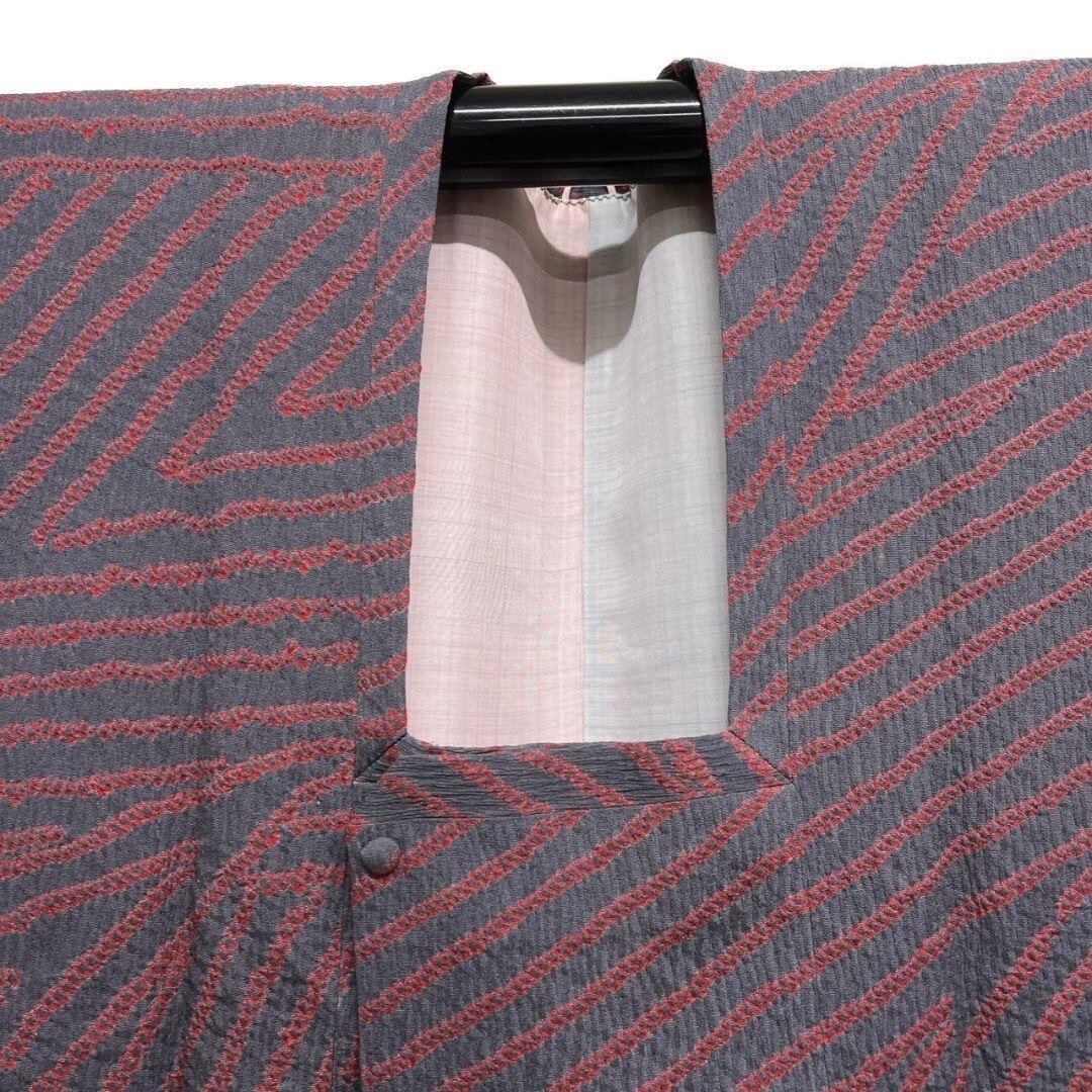 チャコールグレーの落ち着いたお色味に赤の絞り模様が粋なデザインの1着です。