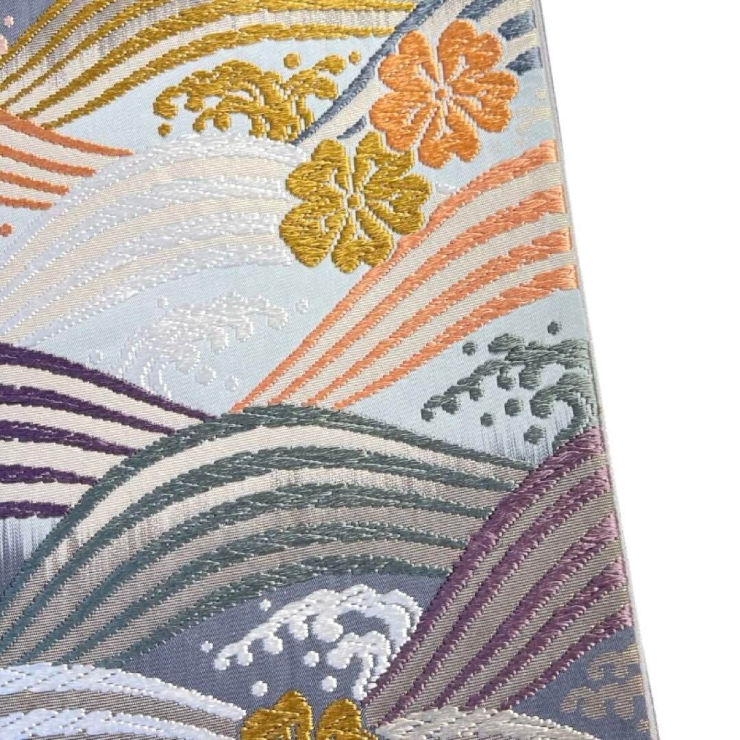 横縞の地に唐織で織られたカラフルな波に桜の文様が華やかなデザインの一着です。