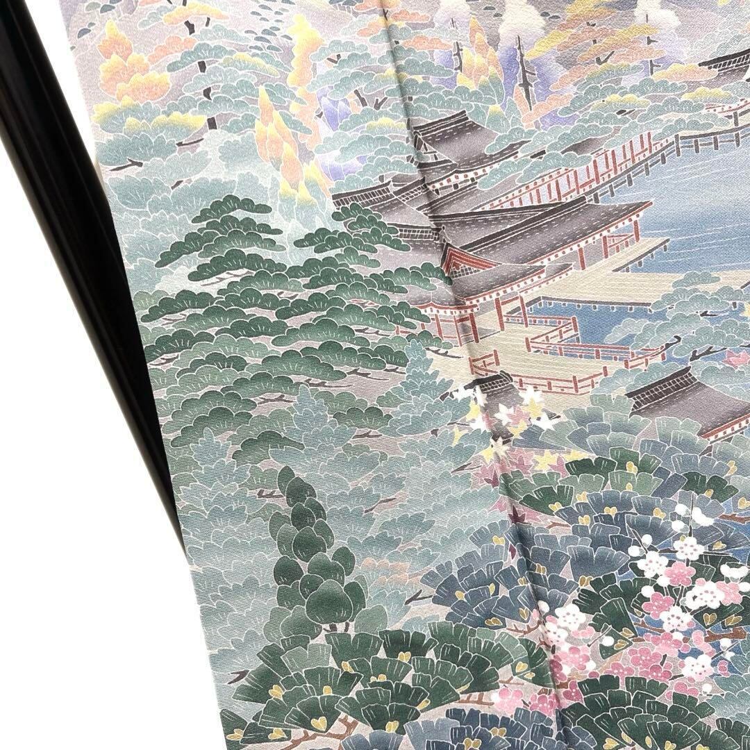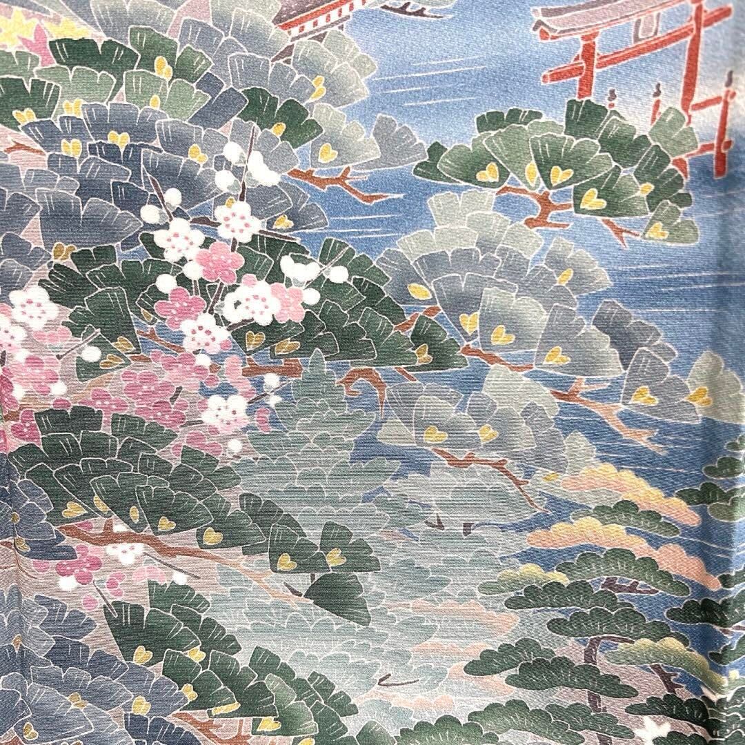 くすみのライトブルーの地に友禅染で細やかに描かれた厳島神社の風景模様が目を惹く華やかなデザインの一着です。