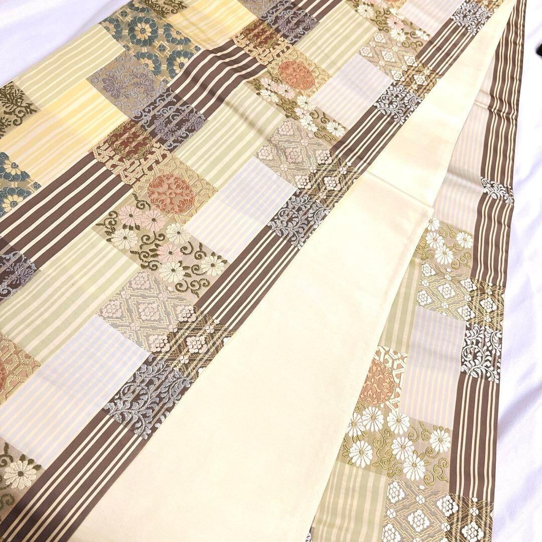 縦縞模様に華紋や唐花模様、花菱が織り出された袋帯です。