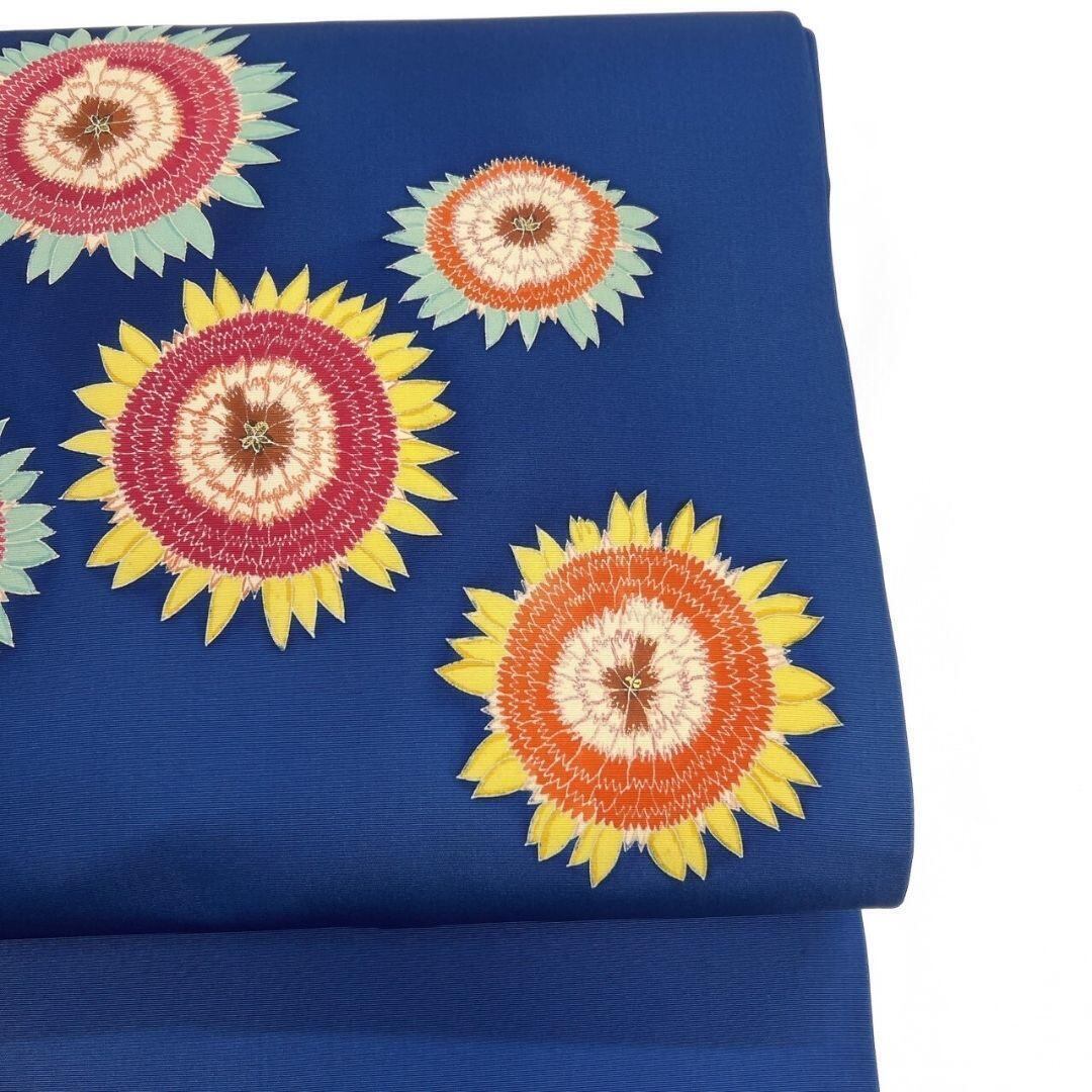 鮮やかな青に繊細なひまわりが生き生きと描かれた塩瀬の1着です。