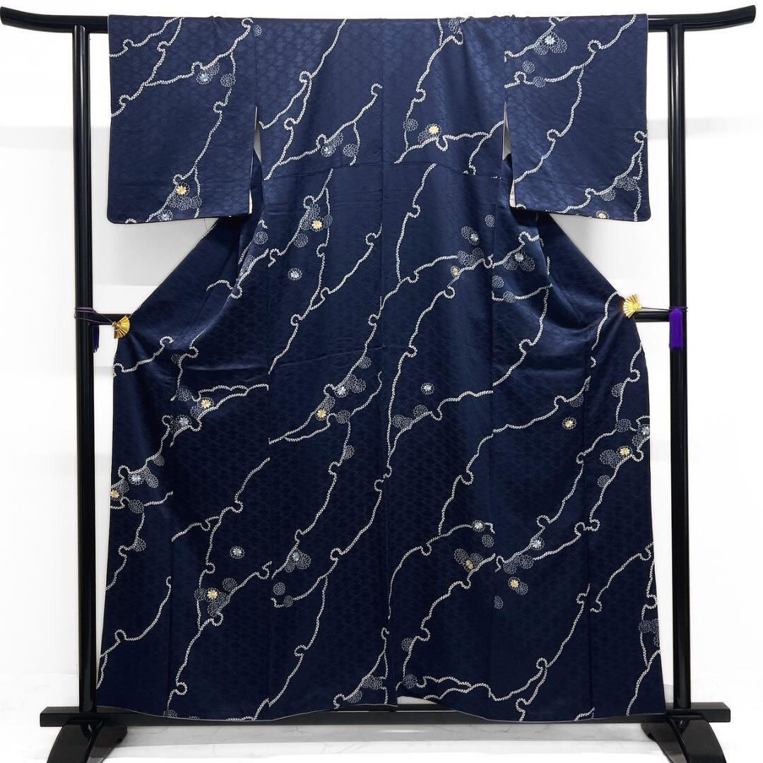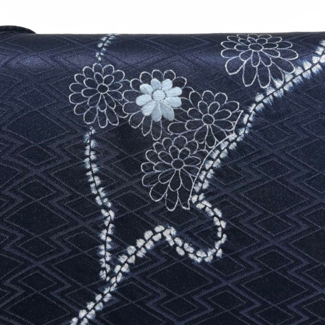 藍染の松皮菱地紋に絞りで描かれた大ぶりの雪輪文様に刺繍を交えた菊花の文様がお洒落なデザインの一着です。