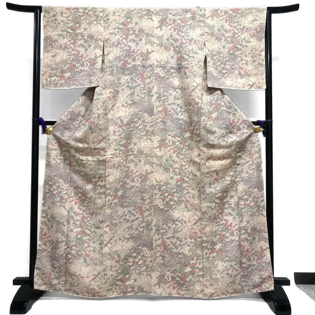 柔らかなお色味の花模様と鳥たちが繊細なタッチで描かれた1着です。