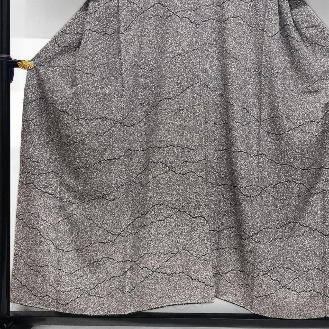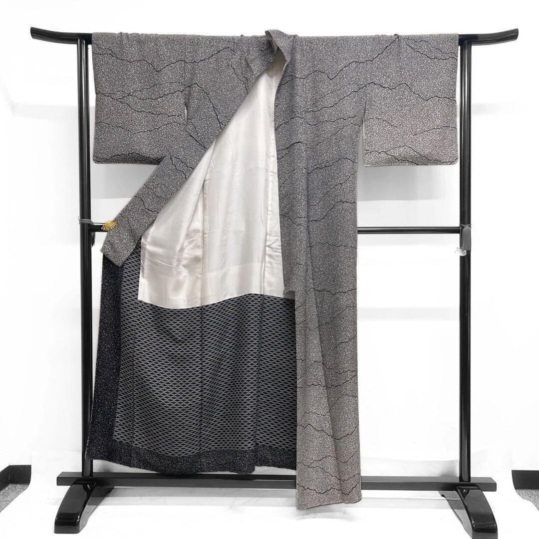 白と黒のモノトーンの細やかなたたき染地に黒の遠山のような抽象的な横縞の文様がお洒落なデザインの一着です。