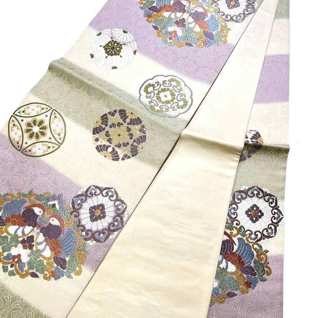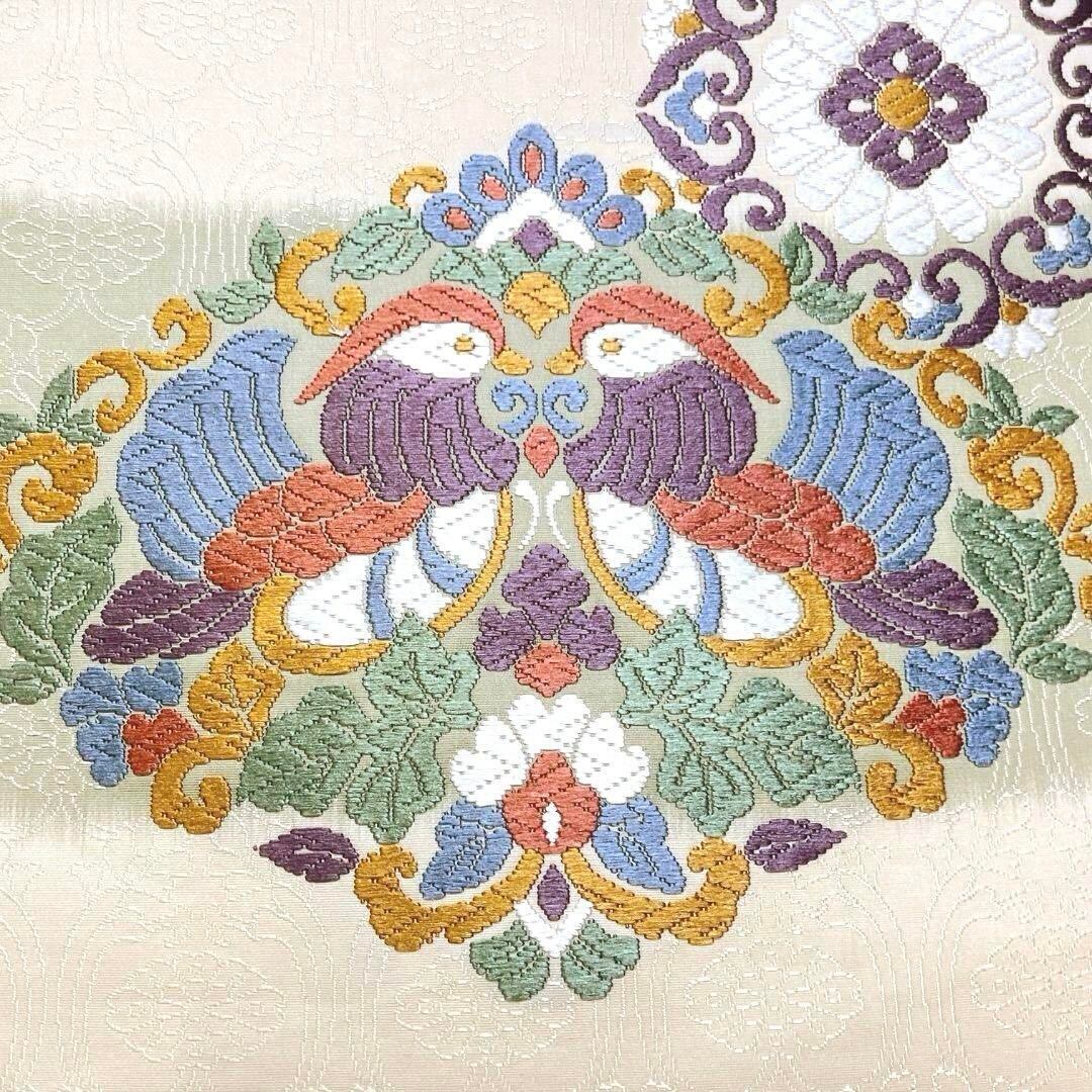 華紋のような地紋の生地に唐織で織られた鴛鴦紋が華やかな一着です。