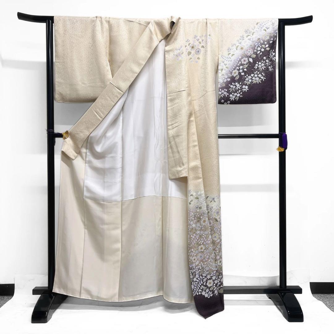 花紗綾形地紋の淡くくすみのあるクリーム色地に細やかに描かれた辻ヶ花の文様に藤や葵ら竹や萩の文様が描かれた華やかなデザインの一着です。