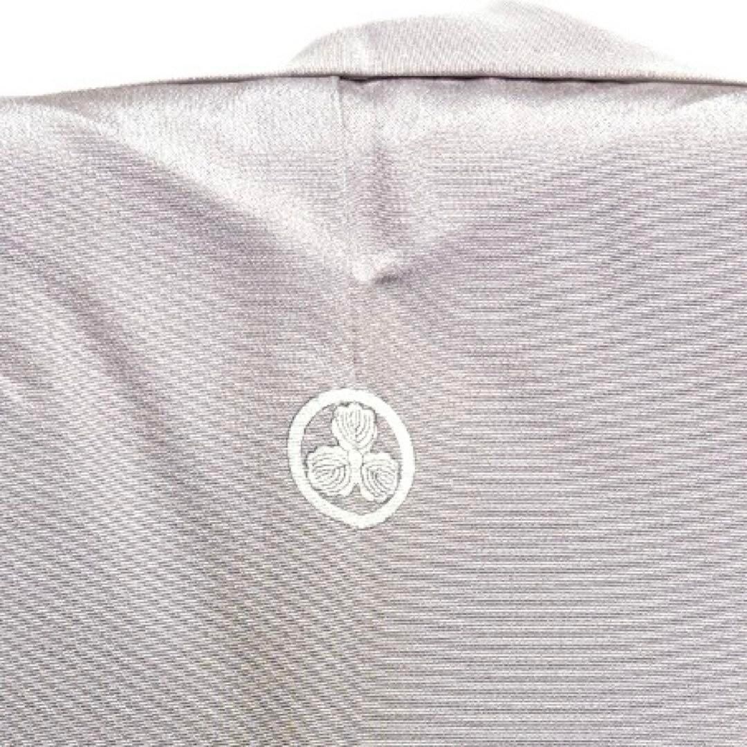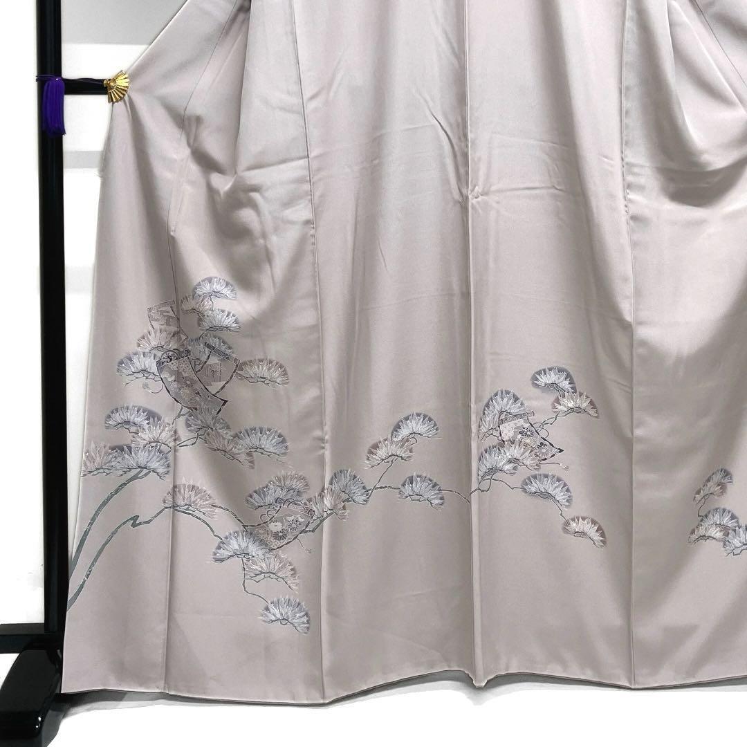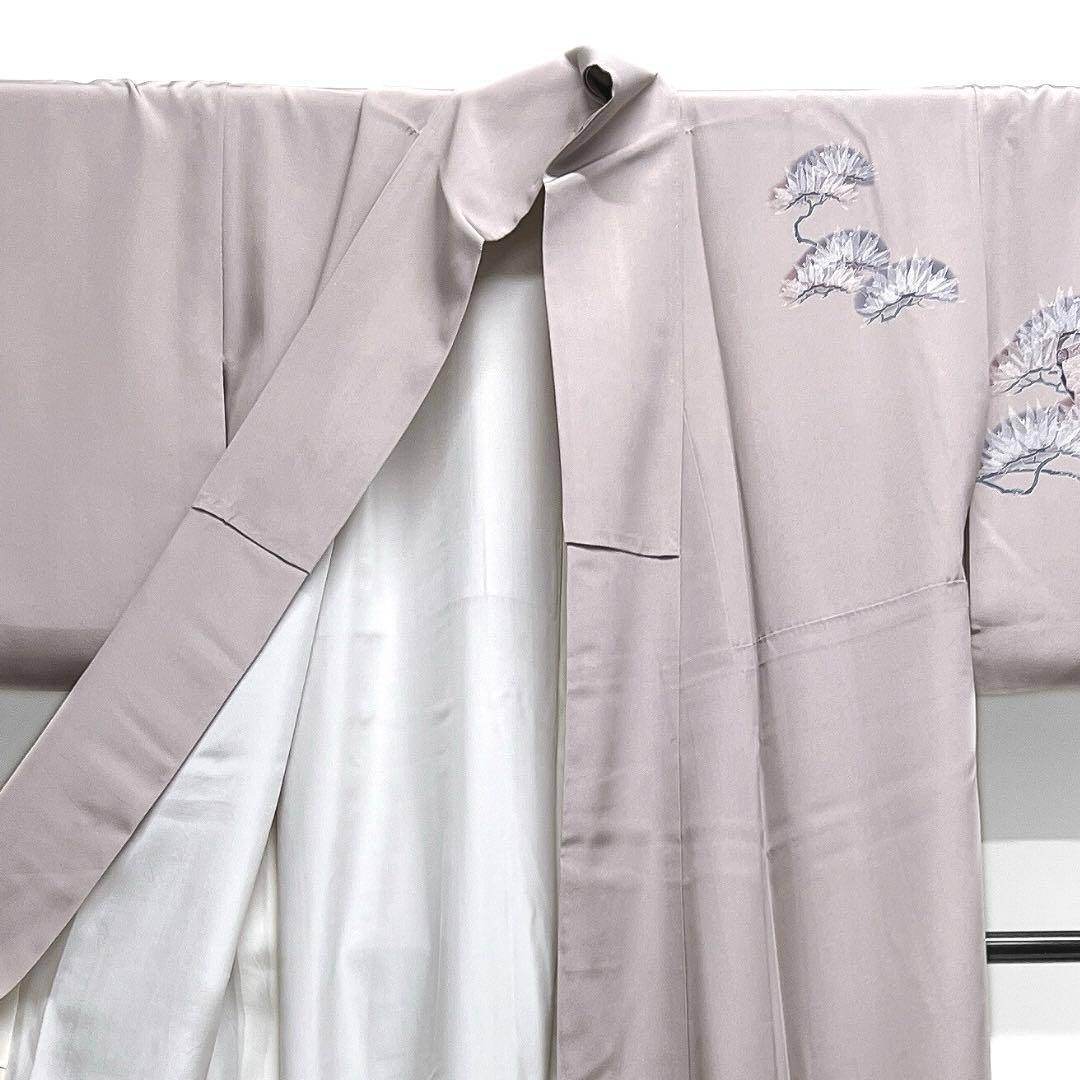 薄いくすみパープルの地に細やかに描かれた松の文様と様々な模様の巻物文様が華やかなデザインの一着です。