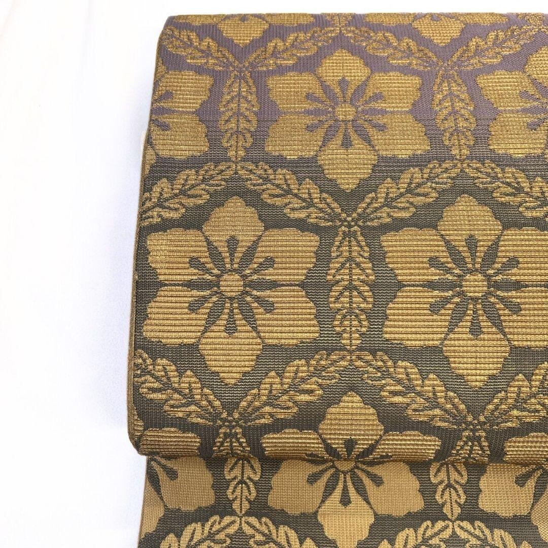 横段に花亀甲やリーフ模様が織り出された袋帯です。