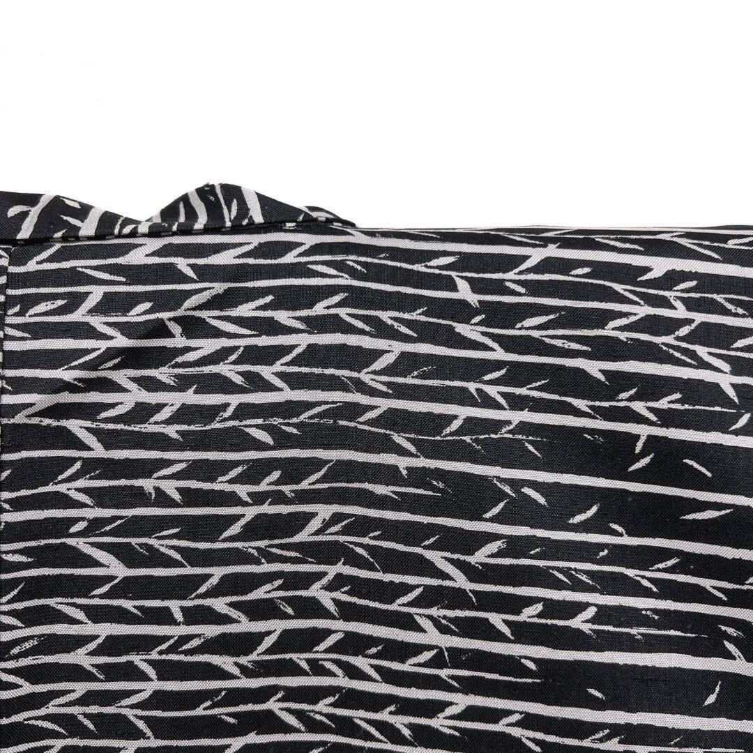紬の黒地に白のモノトーンで織られた横縞に横に伸びた植物文様が珍しいお洒落なデザインの一着です。