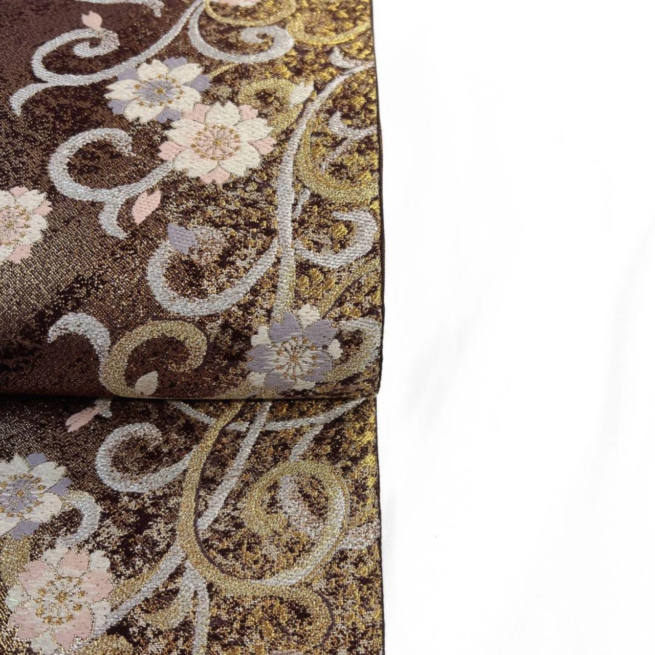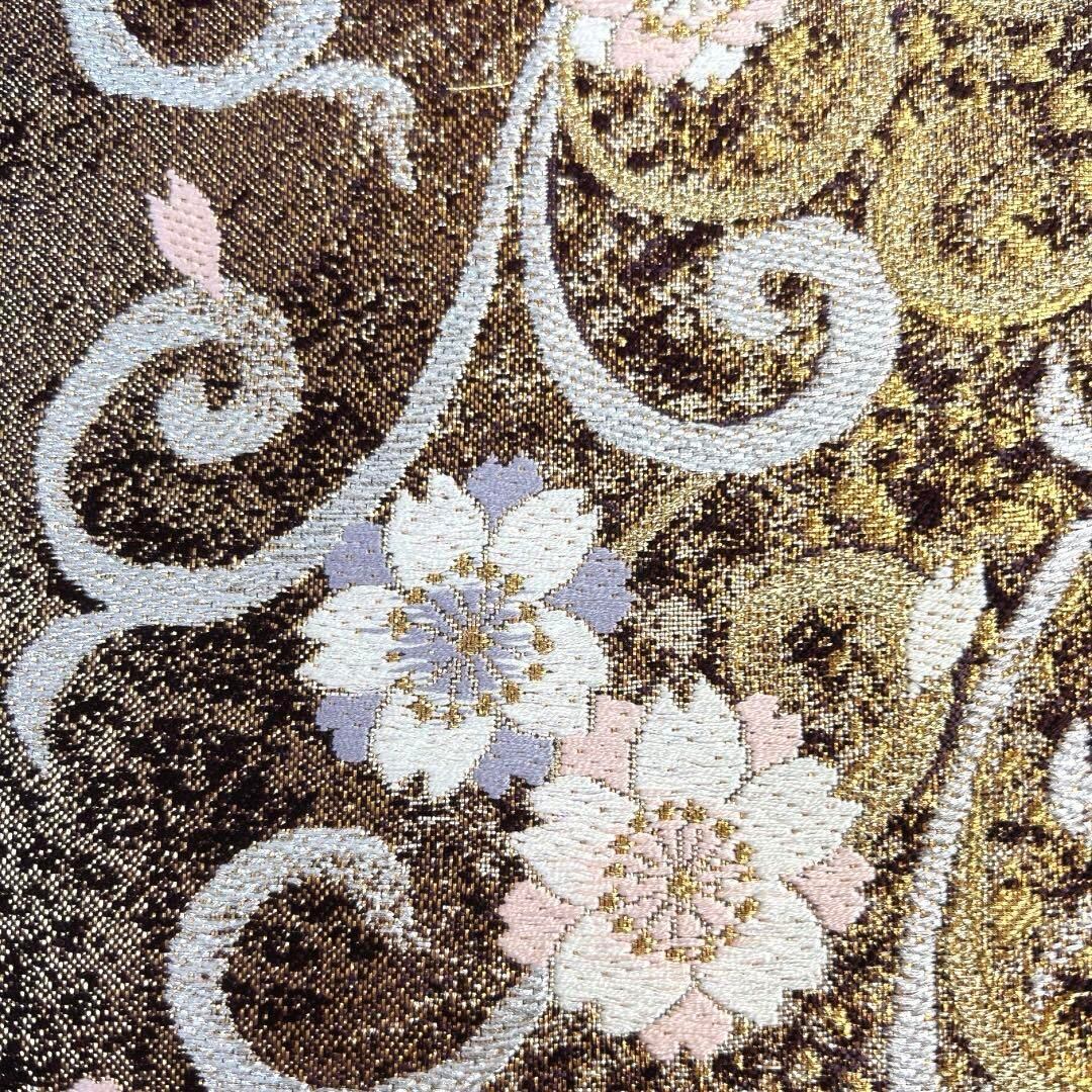 深いバーガンディーとゴールドの地に金糸と銀糸を交えて織られた八重桜に唐草の文様が華やかなデザインの一着です。