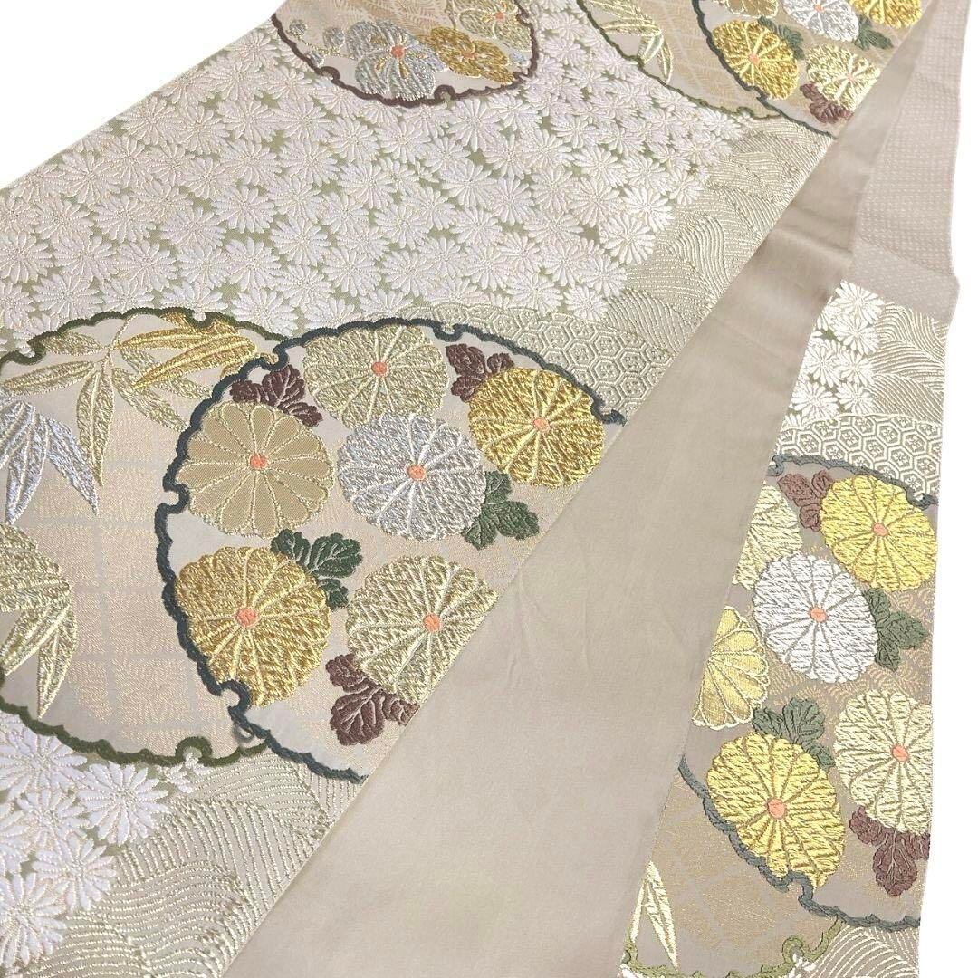 唐織で雪輪や菊花、松竹梅が織り出された袋帯です。