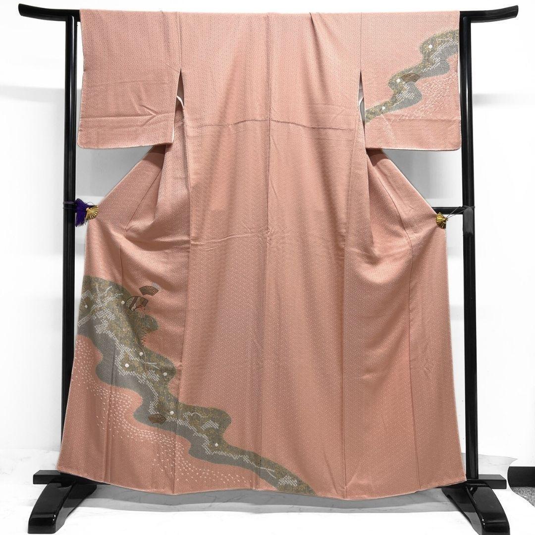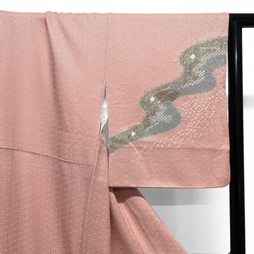 柔らかなお色味に紗綾形地紋と霞取り、菊花、扇、枝垂れ花模様が美しく描かれた一着です。