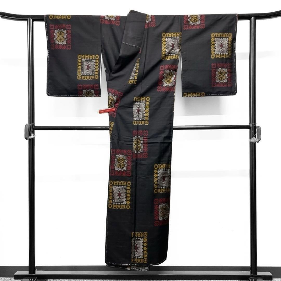 深く黒に近いブラウンに黄色と赤の抽象模様が織られたお洒落な一着です。